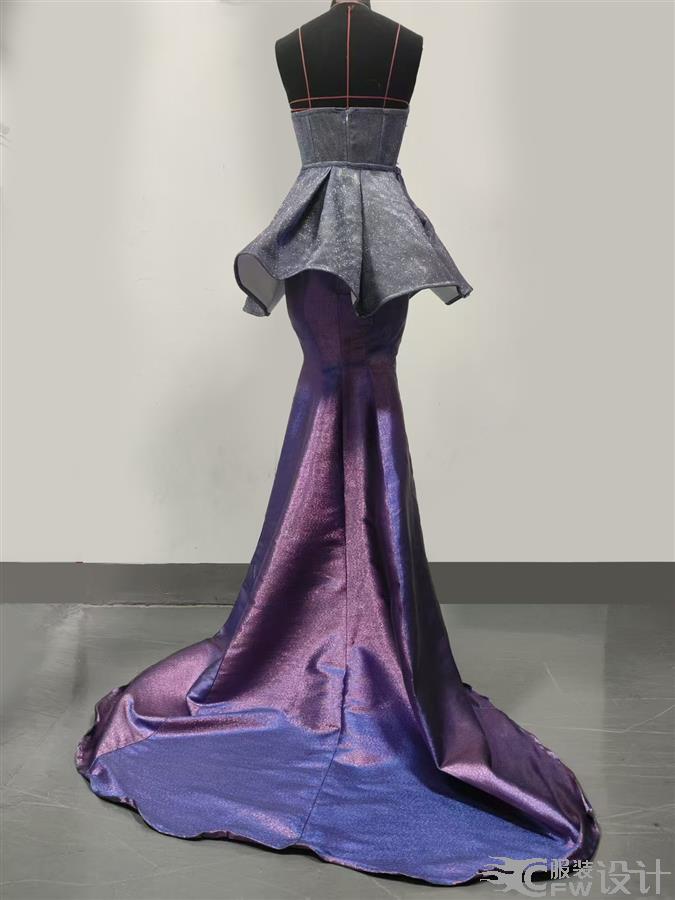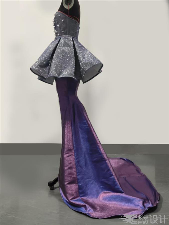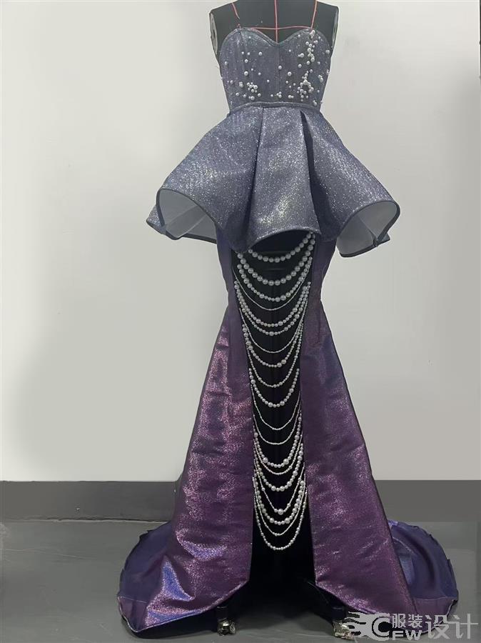 本作品以星空为灵感,采用渐变紫闪面料,上身为抹胸收腰设计,搭配层叠荷叶边,如星夜中翻涌的云浪。珍珠串链从腰际垂落,如星河倾泻,与渐变紫调交相辉映,营造出梦幻而华贵的视觉效果,传递出浪漫而神秘的氛围。