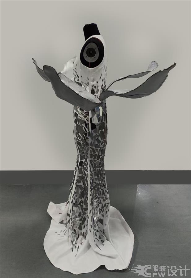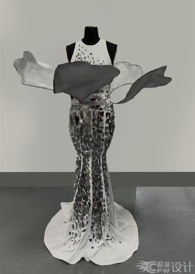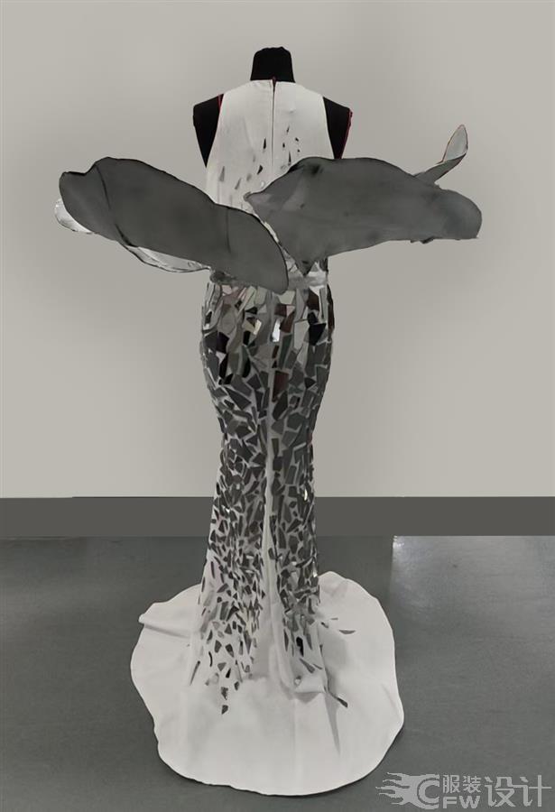 作品萃取牡丹盛放形态,修身鱼尾裙身结合层叠花瓣式立体剪裁。以镜面碎片拼接模拟牡丹华贵光泽,白色欧根纱柔化质感,传统国花意象与先锋材质相融,打造兼具古典风骨与现代感的服装语言。