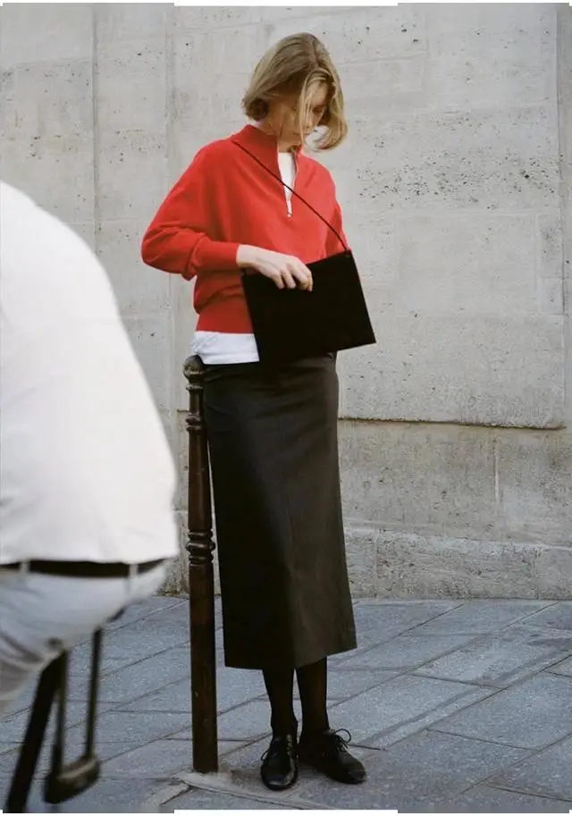 同样是毛衣配黑色半裙,不同的材质呈现的出来的效果完全不同,极简的款式简单利落,很有大女主的气场。