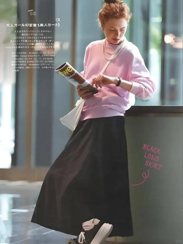 到了30多岁以后,在穿搭上就是以大方干净为主,不用多么复杂的元素,特别是卫衣,越简单越好,粉色卫衣配黑色半裙,叠戴珍珠项链很特别的点缀,既减龄又不失稳重。