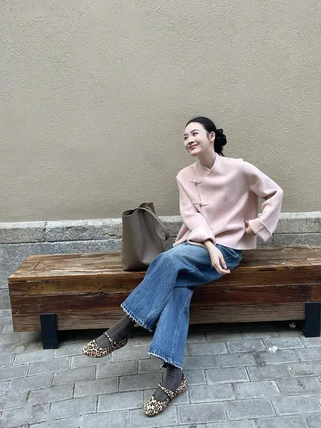 今年依然是新中式流行的一年,粉色新中式短款大衣,简简单单的搭配牛仔直筒裤,一双豹纹玛丽珍鞋提高了穿搭的时髦度。