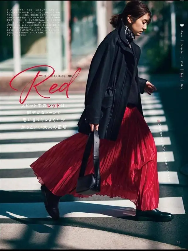 以前总有姐妹跟我说不喜欢夹克,觉得夹克不够时髦,其实错了,黑色夹克外套搭配百褶的红色半裙,轻盈的裙摆,浪漫又优雅,很好的中和了夹克的硬朗。