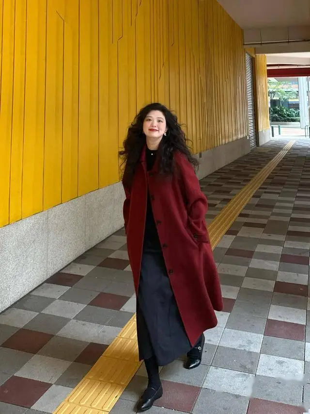 如果你喜欢更加热烈一点,那么把黑色大衣换成红色大衣,配一身黑色内搭,搭配卷发,很有港式复古风。