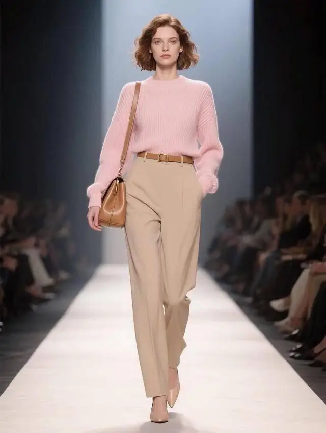 相比粉色衬衣,粉色毛衣更多了几分温柔,搭配卡其直筒裤,用同色系的卡其皮带打造腰线,再搭配卡其包包,极简配色,干净又干练。