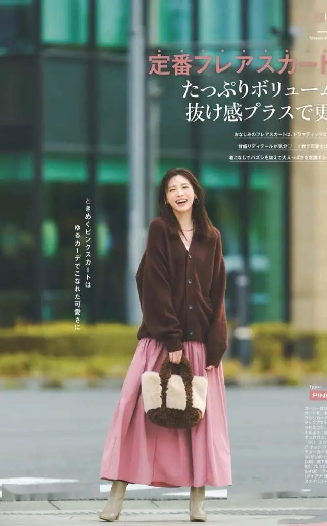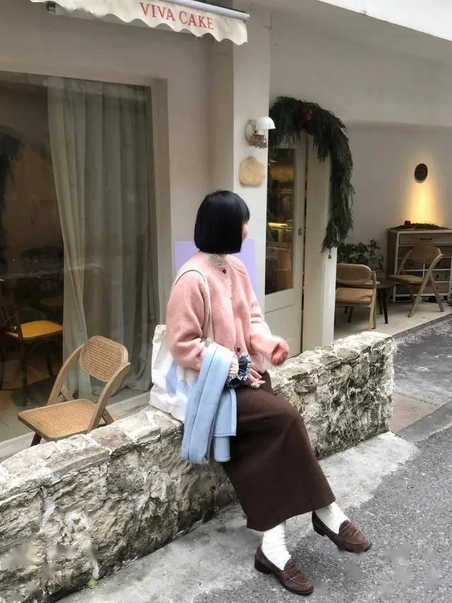 粉色开衫叠穿高领打底衫,配深棕色的半裙,想要营造一种文艺又显高的效果,鞋子最好喝裙子同色系,这样在视觉上更显高。