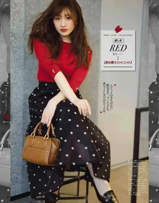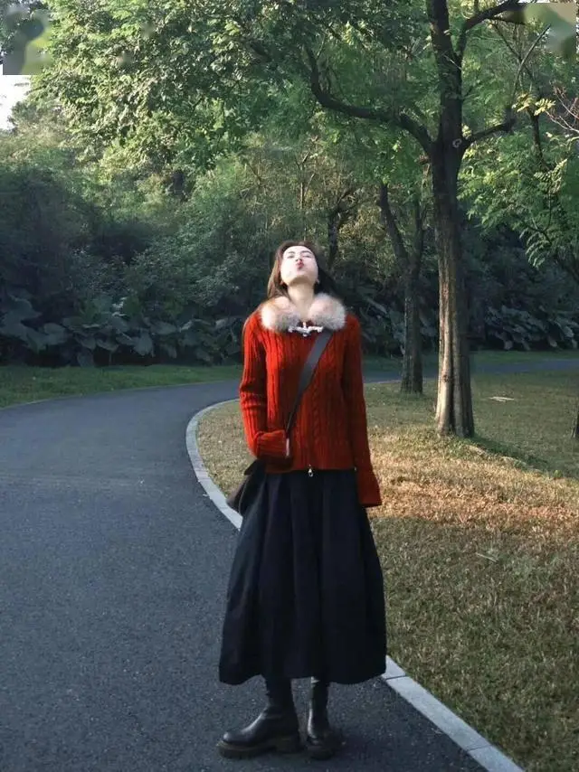 春天,正是穿毛衣的季节,红色绞花毛衣搭配黑色伞裙,配上一双黑色短靴,温柔大气。
