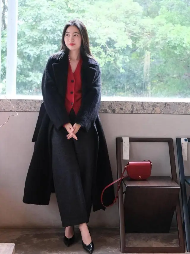 广东这边虽然已经穿短袖了,但是我看好多地方还在下雪,所以厚外套还是不能脱下,大衣依然要穿。黑色大衣,经典不出错,搭配V领红色毛衣,配九分黑色羊毛裤,一身知性优雅。