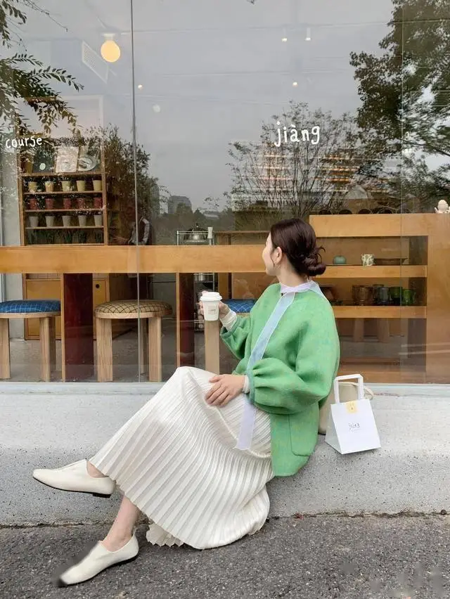 绿色绞花毛衣叠穿白色衬衣,衬衣的领子无需翻出来,反而更加时髦,搭配卡其阔腿裤,扎个低马尾,利落洋气的look。