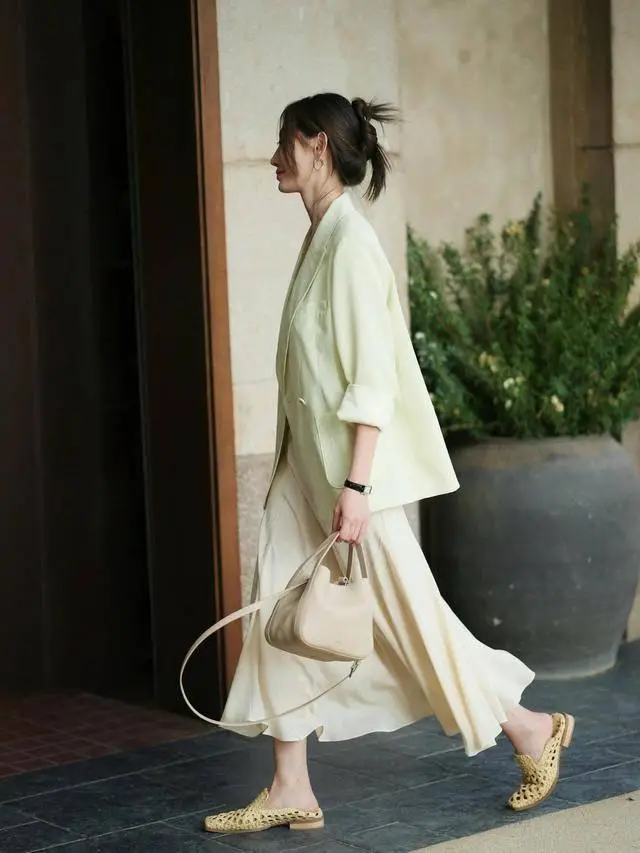 这一身就更加清新了,浅绿色西装搭配白色半裙,轻盈飘逸,春天穿这一身出门太抢眼了。