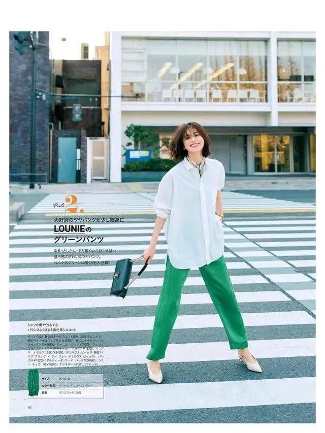 对于职场的女性来说,可以把绿色放在下半身,上衣选择白色衬衣,比如说龙洋这身白色缎面衬衣搭配绿色直筒裤,配一双裸色高跟鞋,优雅知性。