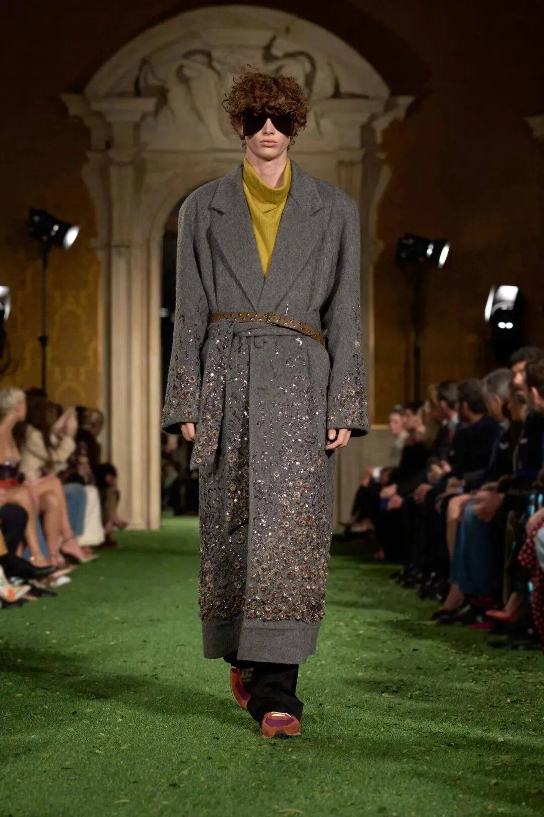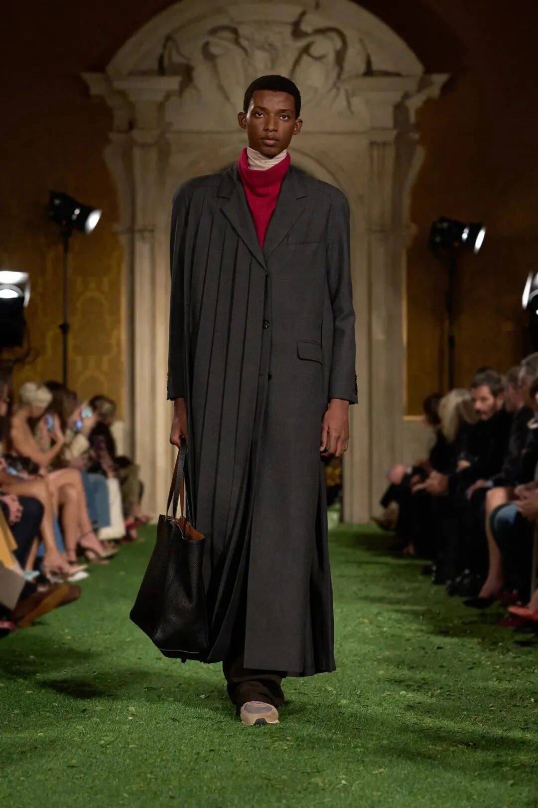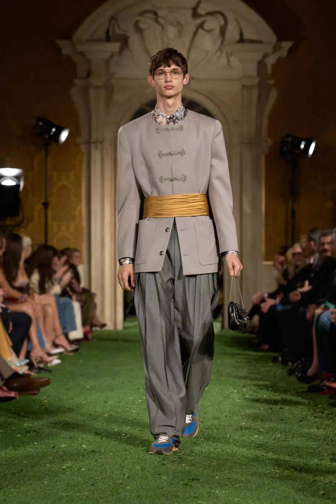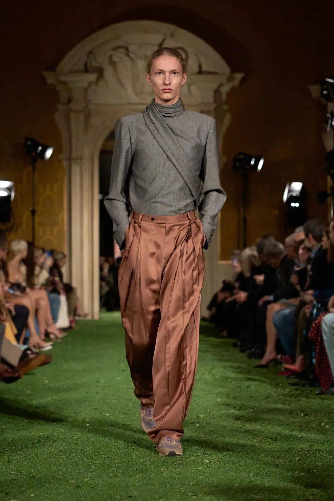 男装系列虽然混搭感较低,但张力同样明显。第五套造型中,灰色双排扣夹克正面看似寻常,背后却迸发出如螺旋桨搅动水流般的褶皱涡流,打破视觉和谐。阔腿裤通过刻意混搭的褶皱形成造型,带有教堂风格的褶裥与垂坠,呼应了秀场头顶巴贝里尼宫天花板上Cortona所绘的华丽衣饰。