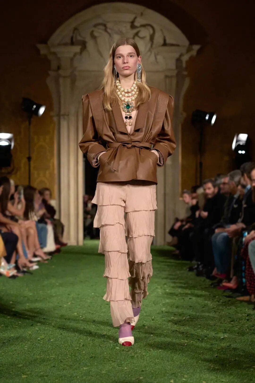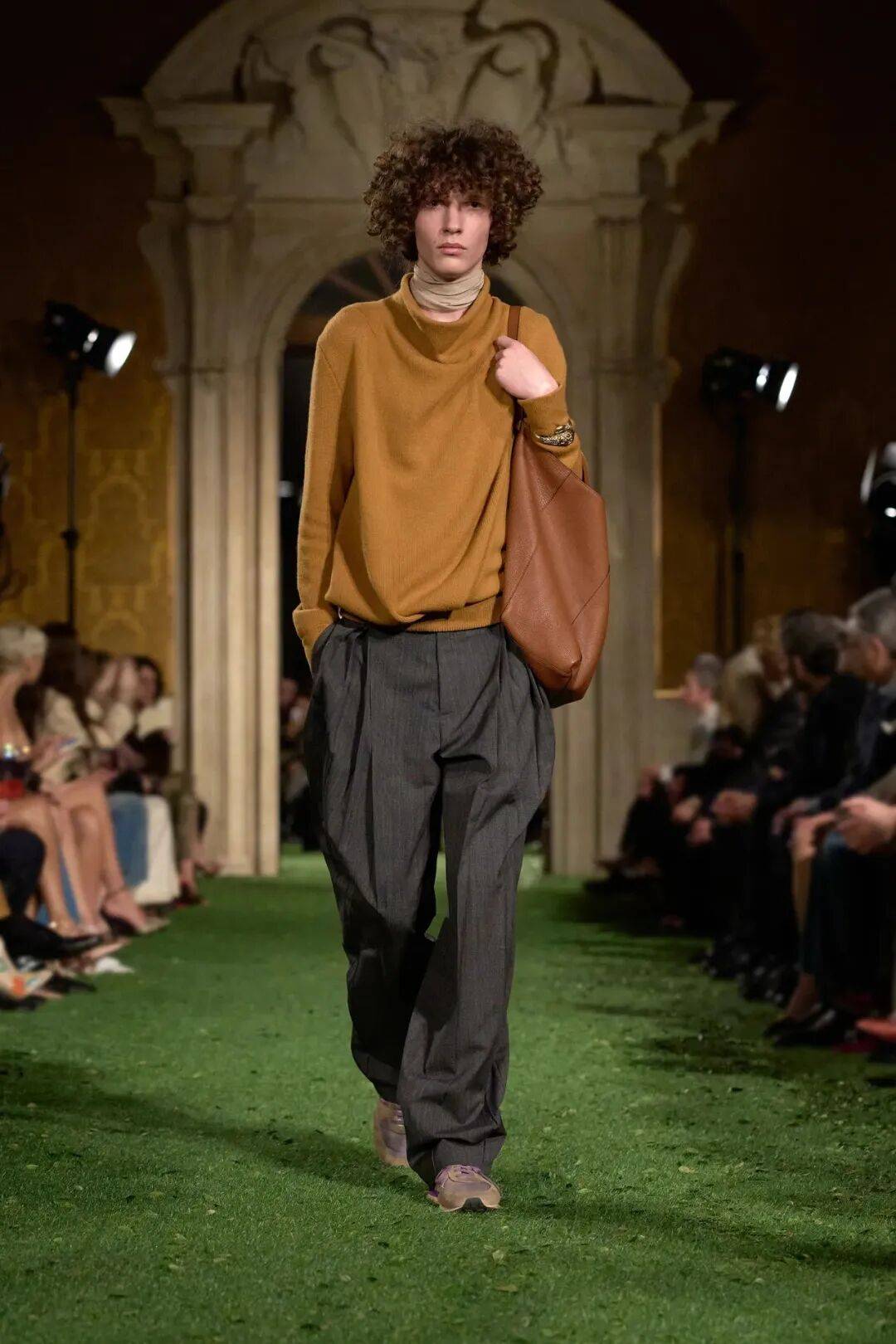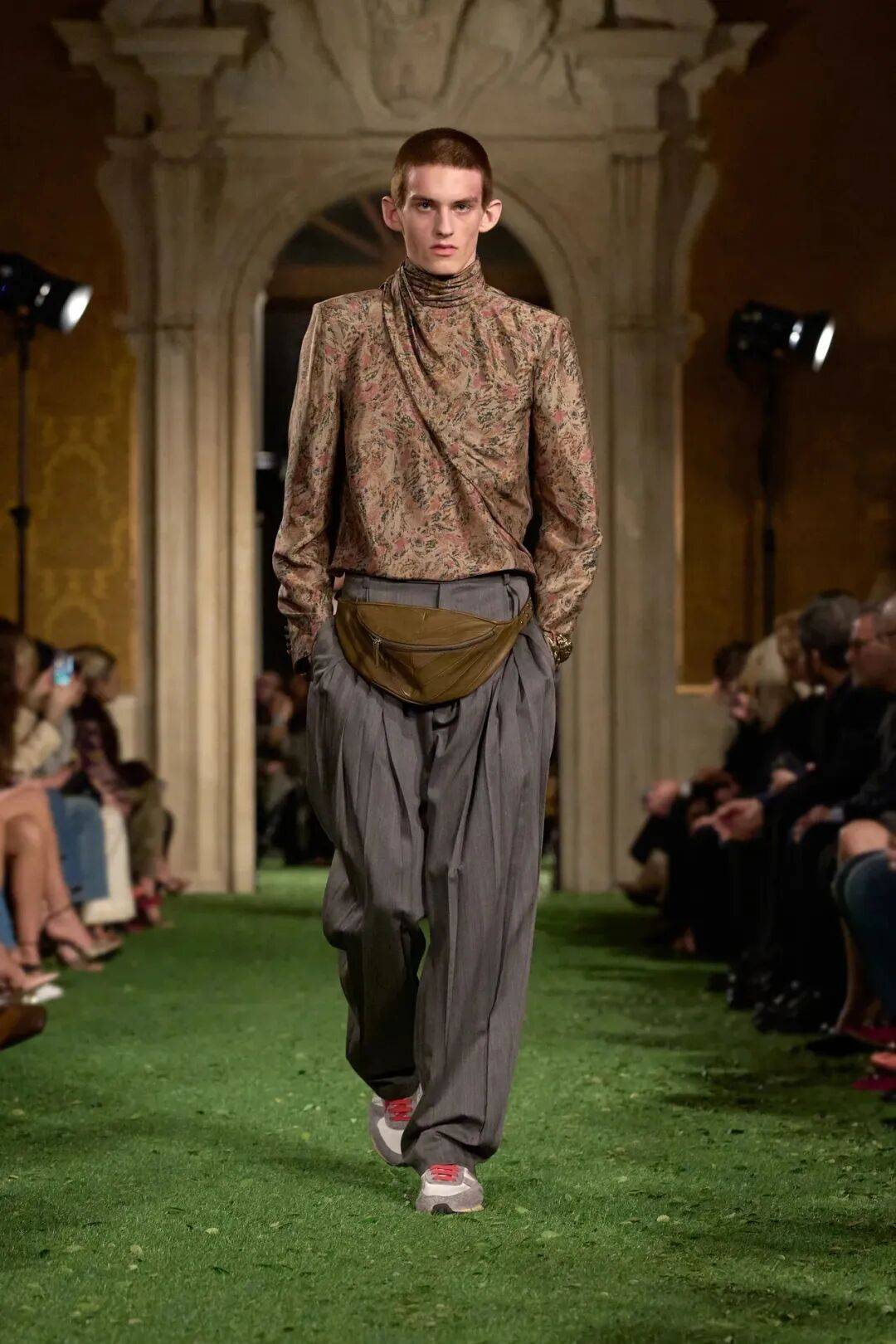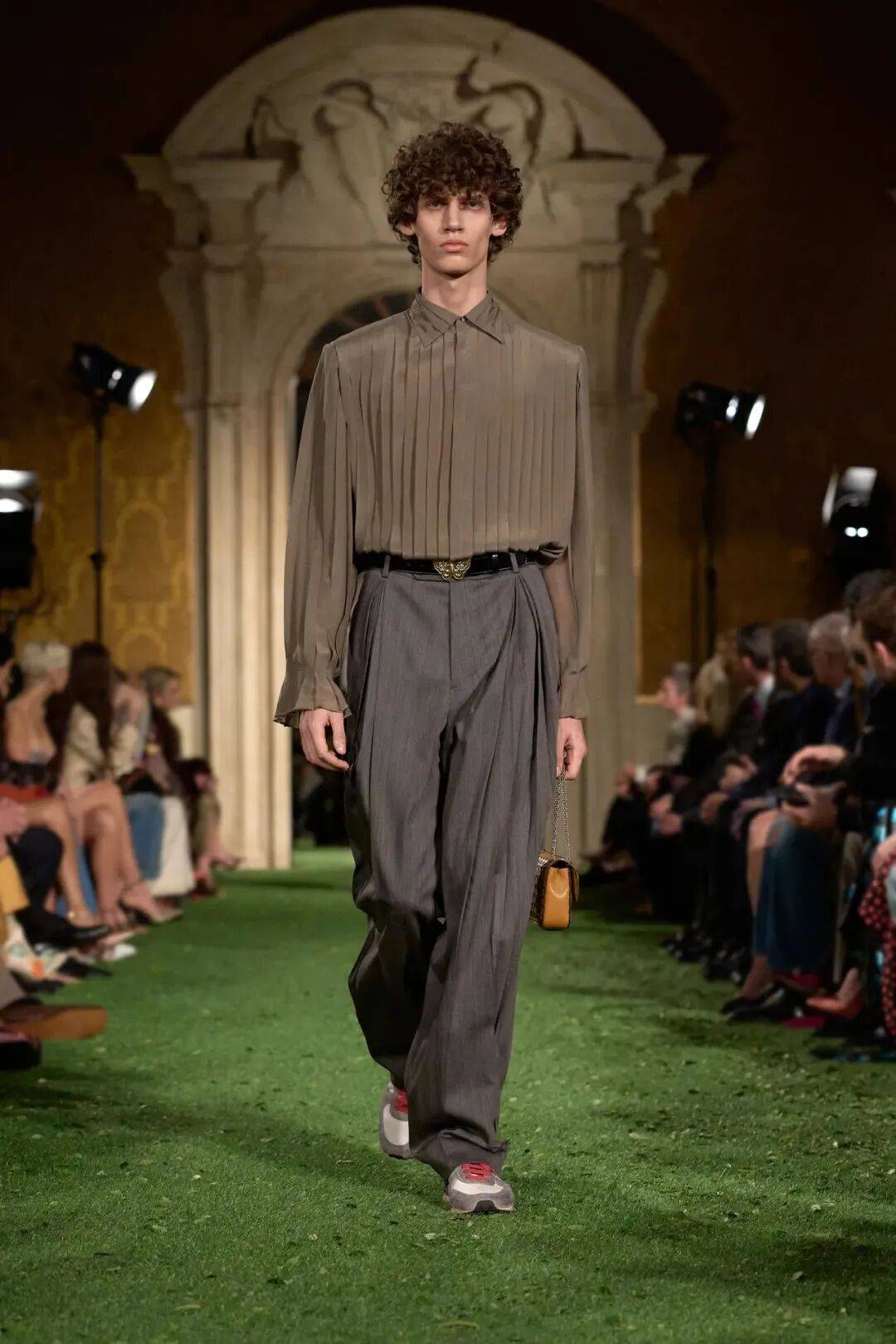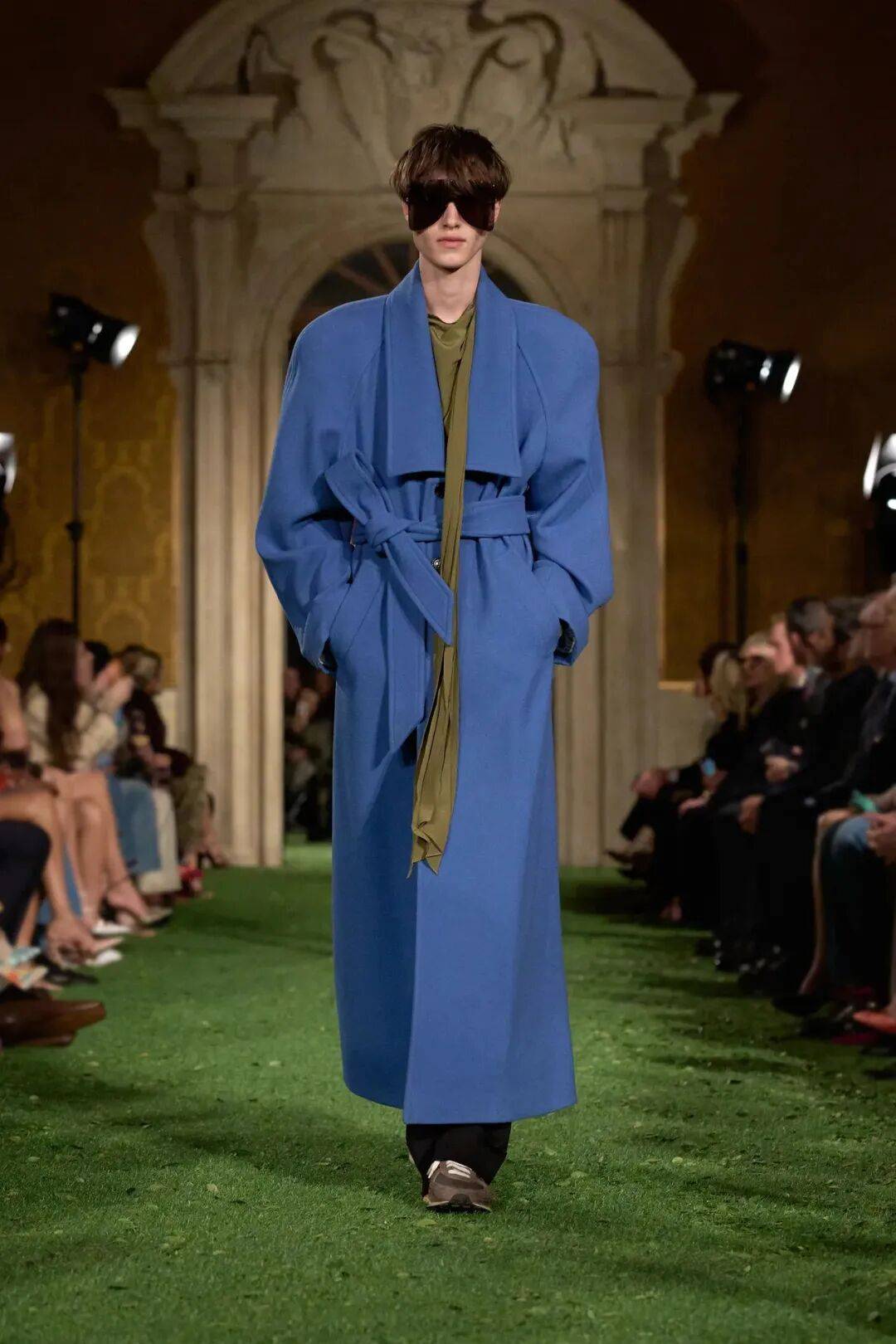 男装系列虽然混搭感较低,但张力同样明显。第五套造型中,灰色双排扣夹克正面看似寻常,背后却迸发出如螺旋桨搅动水流般的褶皱涡流,打破视觉和谐。阔腿裤通过刻意混搭的褶皱形成造型,带有教堂风格的褶裥与垂坠,呼应了秀场头顶巴贝里尼宫天花板上Cortona所绘的华丽衣饰。