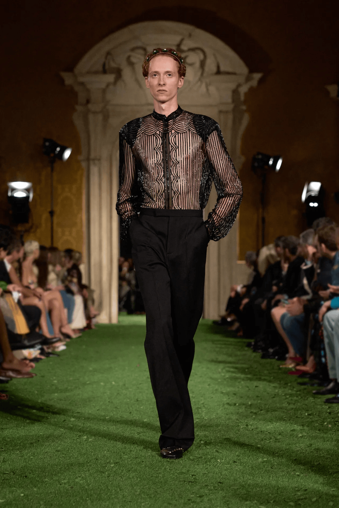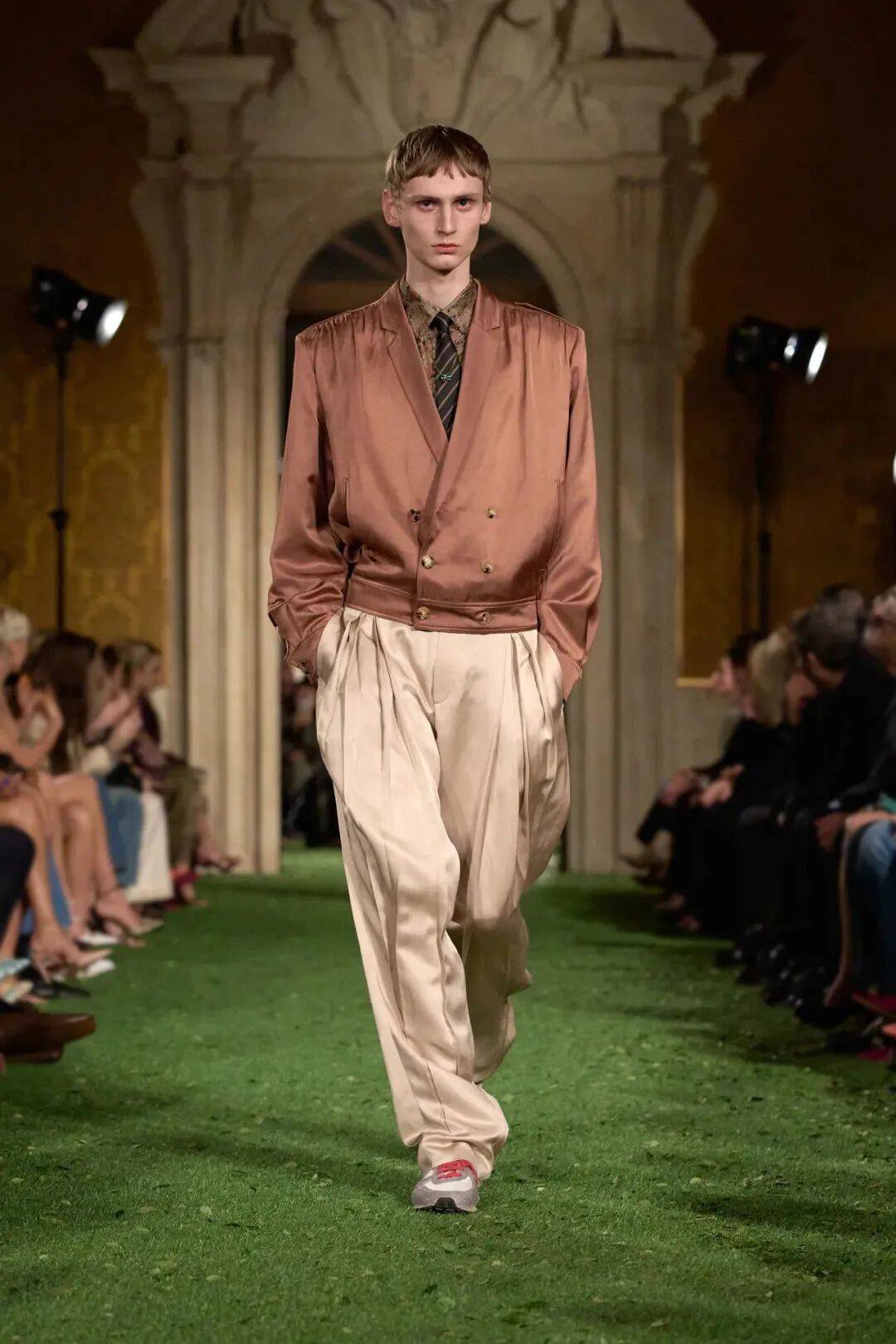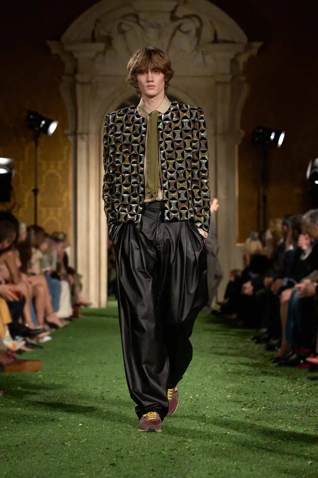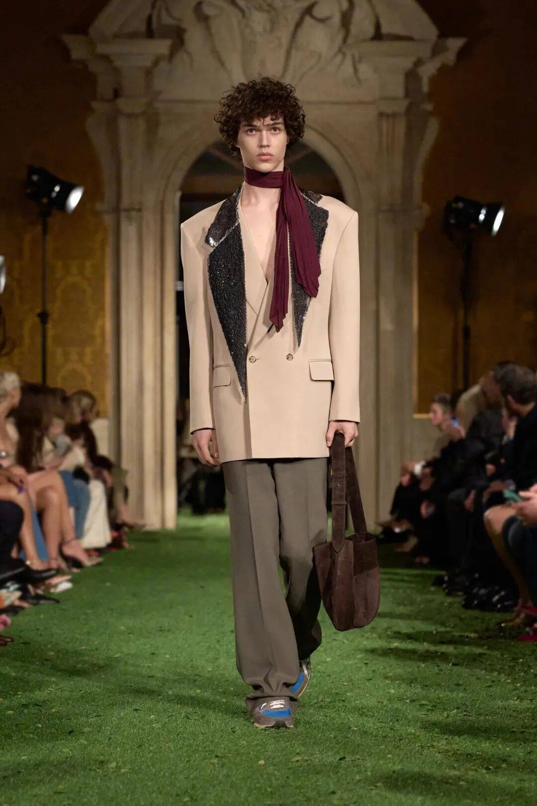 男装系列虽然混搭感较低,但张力同样明显。第五套造型中,灰色双排扣夹克正面看似寻常,背后却迸发出如螺旋桨搅动水流般的褶皱涡流,打破视觉和谐。阔腿裤通过刻意混搭的褶皱形成造型,带有教堂风格的褶裥与垂坠,呼应了秀场头顶巴贝里尼宫天花板上Cortona所绘的华丽衣饰。