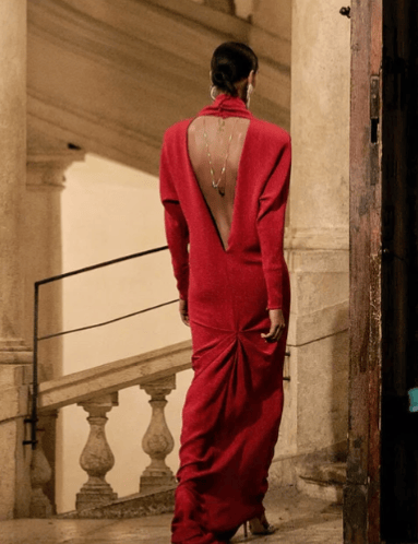 压轴的全长红色礼服成为整场秀的情感高潮。礼服背部的V形开口从肩膀一直延伸到骶骨,既向已故创始人Valentino Garavani致敬,也象征着经过复杂创作后的释放。Michele对红色的处理充满哲学意味:“红色自带存在感,我决定释放它的力量。红色极难驾驭……在此地,它是令人触目惊心的印记。”