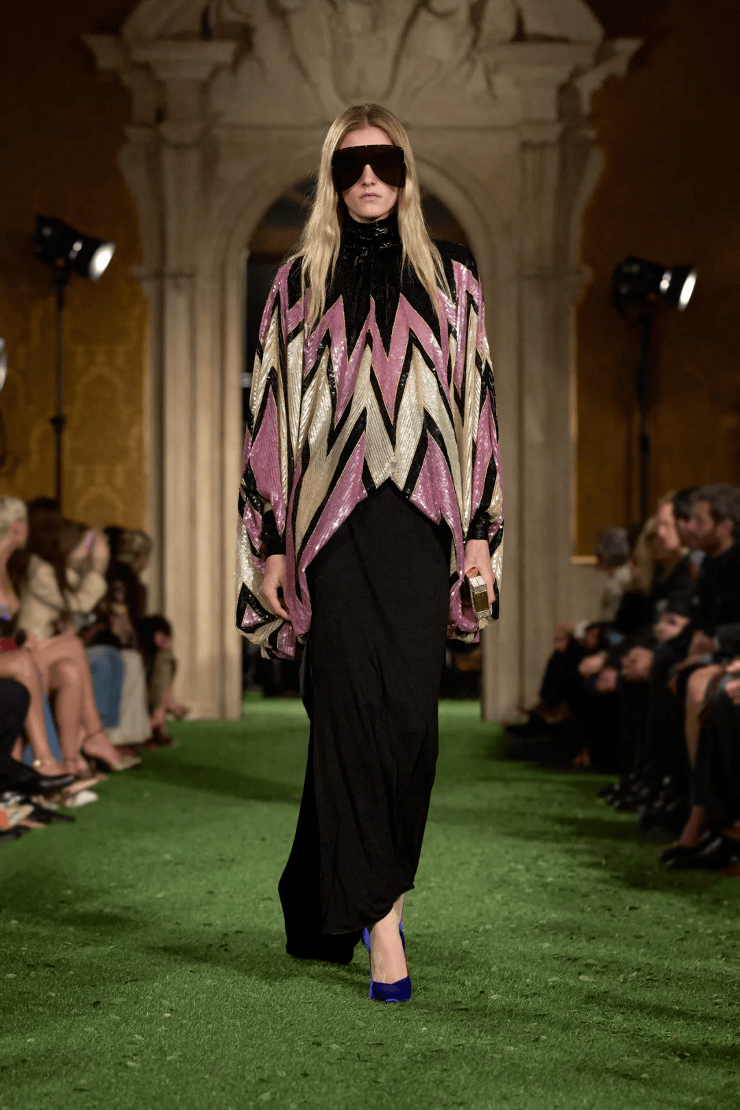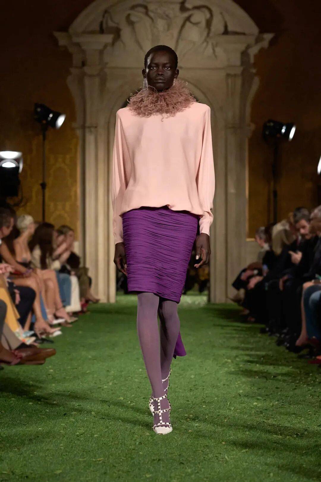 双面塔夫绸的旋转扭褶从臀部盘起,垂至前方深V开口处,并以蕾丝框边。黑边粉色与象牙色的锯齿形拼接亮片外套则生动诠释了Michele想要传达的“视觉冲击力”。这些设计共同构成了Valentino式的“对比美学”:轻盈与厚重、结构与流动、优雅与叛逆不断相遇。
