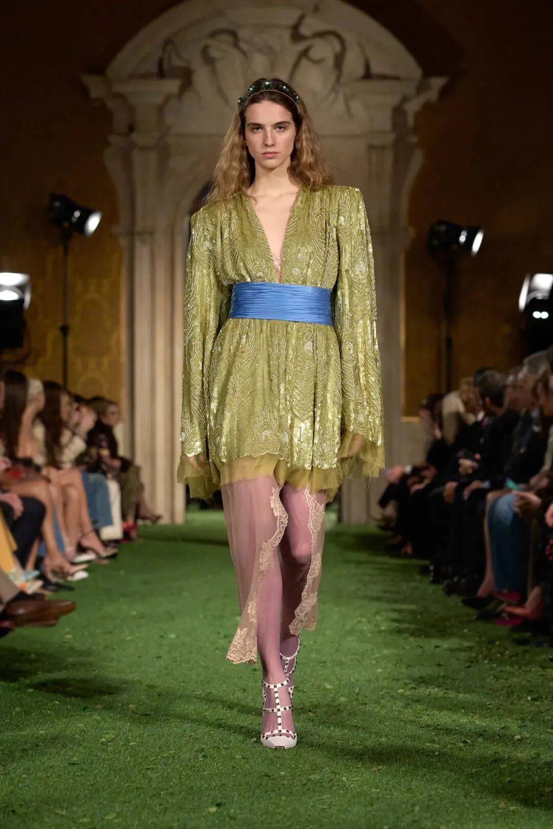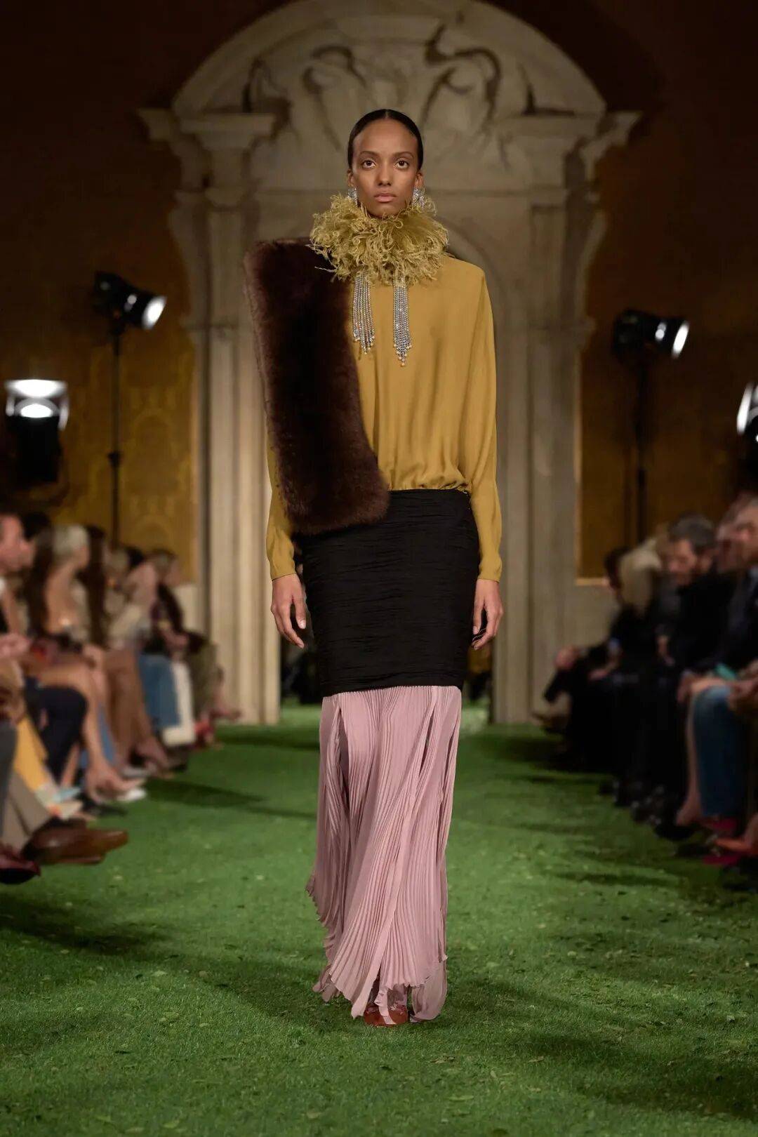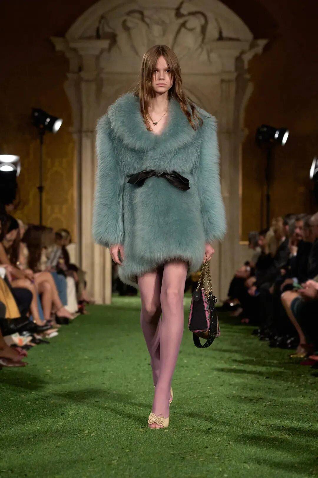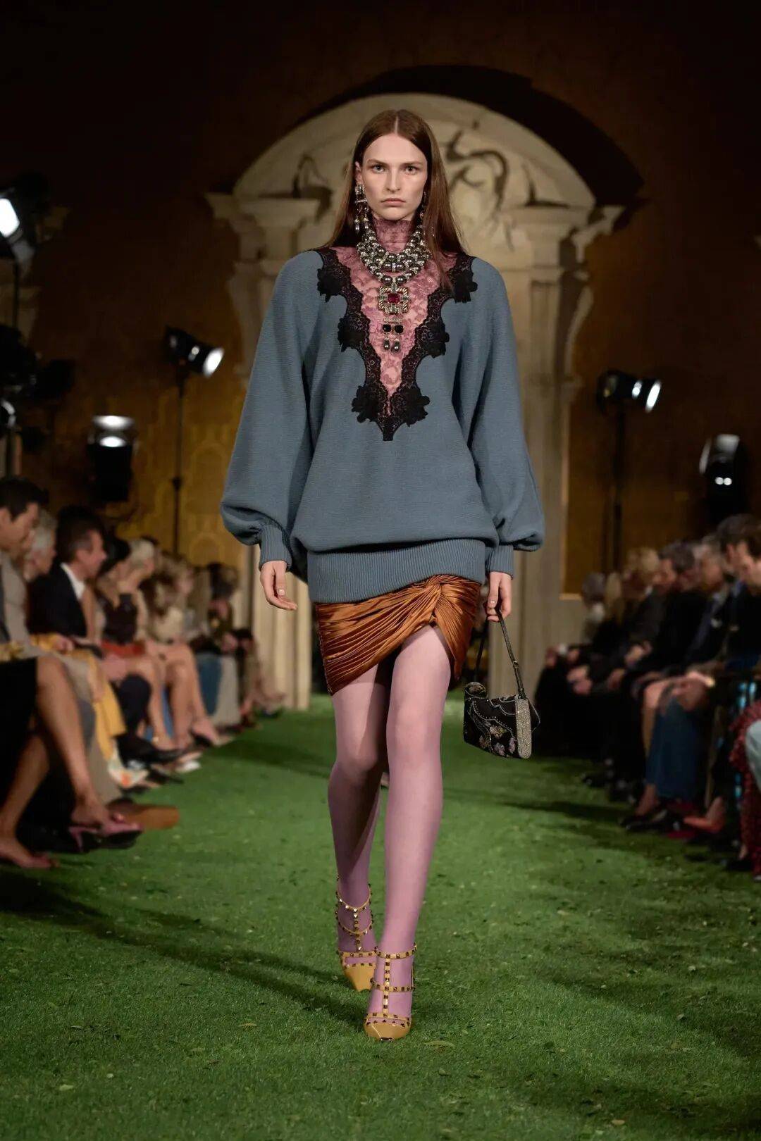 整个系列彰显了Michele标志性的杂揉审美。80年代末的奢华感通过加厚且圆润的肩线重新演绎,有时配以蝴蝶形金属装饰,暗示着设计师探索的变形主题。蝴蝶结腰带收紧全长皮草或短款裹身皮衣,肩部宽大且动作感十足;缎面腰带横跨色块拼接的百褶长衫,或覆盖在镶蕾丝下摆的牛仔裤与Rockstud高跟鞋之上。