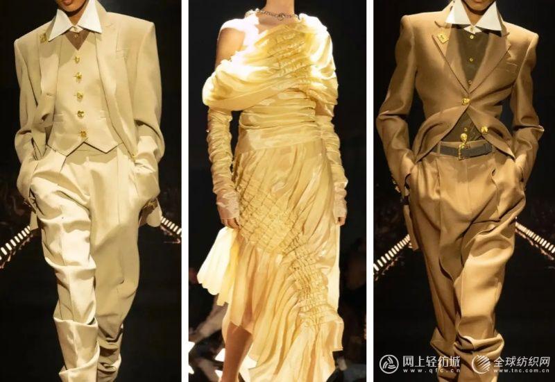 凭借在Thom Browne积累的剪裁功底,开场的中性三件套西装奠定基调:利落挺括的领型自带气场,垂坠百褶裤中和硬朗,搭配金色人面鞋跟踝靴,将建筑感与艺术感完美融合。