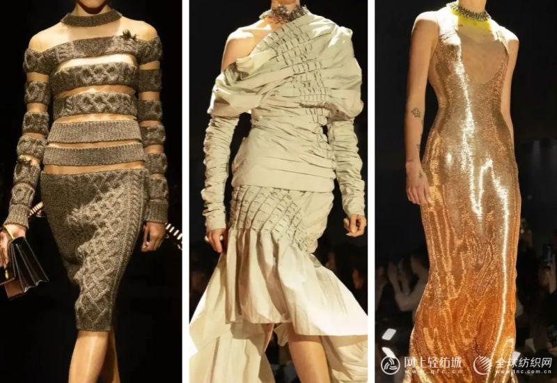 超现实主义细节贯穿系列:钢丝裙摆勾勒灵动尾状,螺旋剪裁礼服以液态丝缎与透明工艺打造,刚柔反差鲜明;卡式磁带与碎光盘拼接的套装,将旧科技转化为未来面料,暗合时光轮回的隐喻。