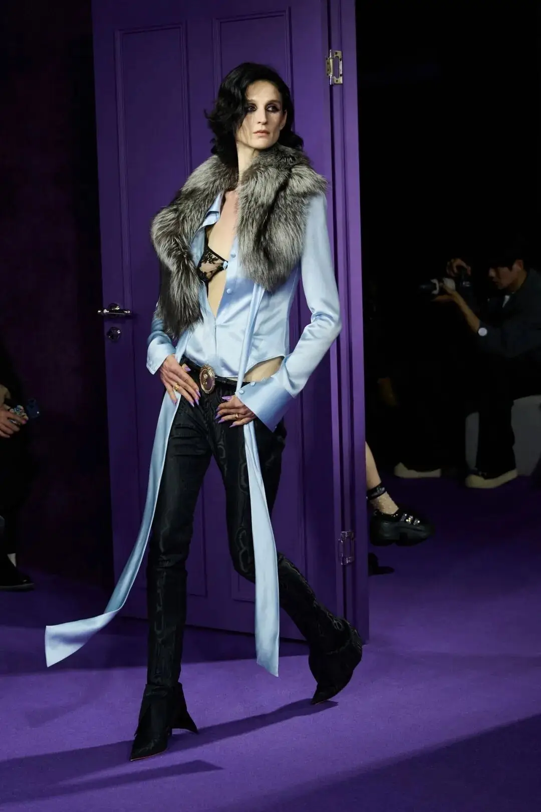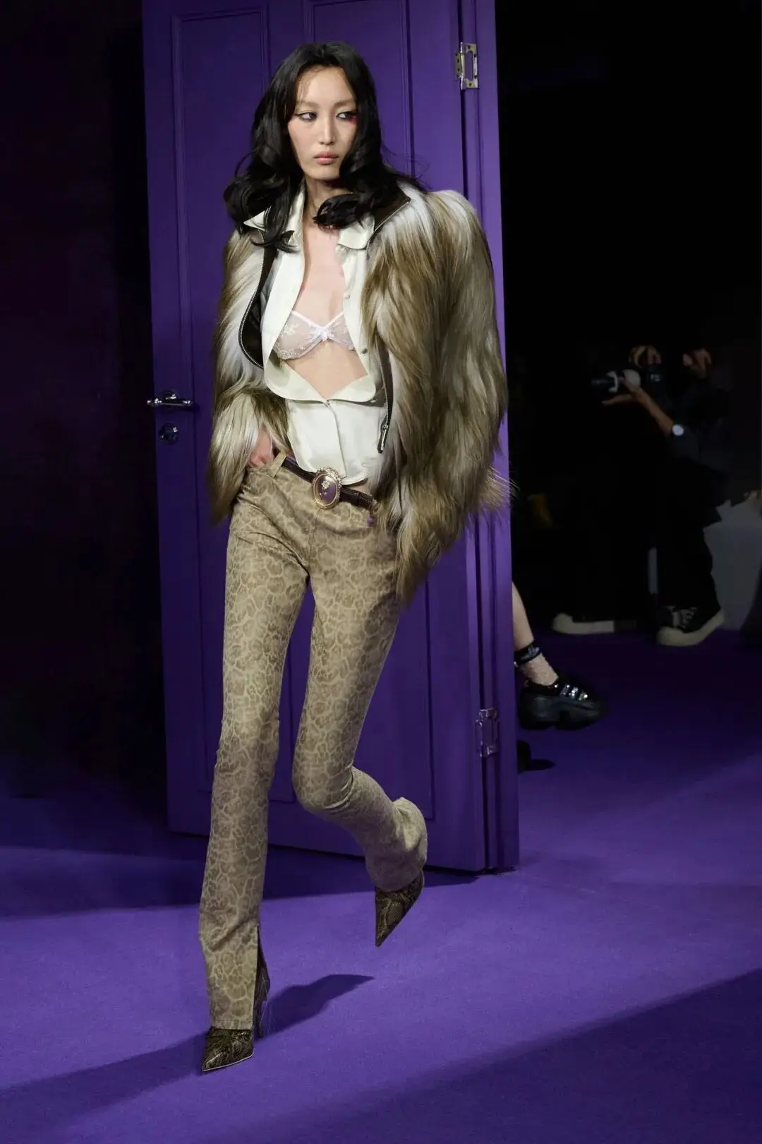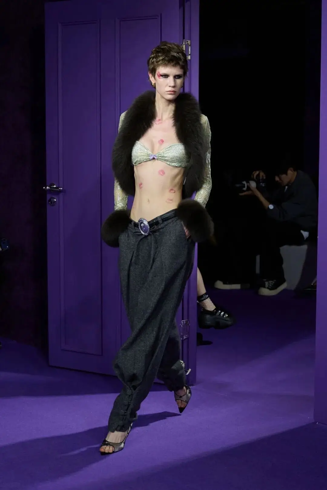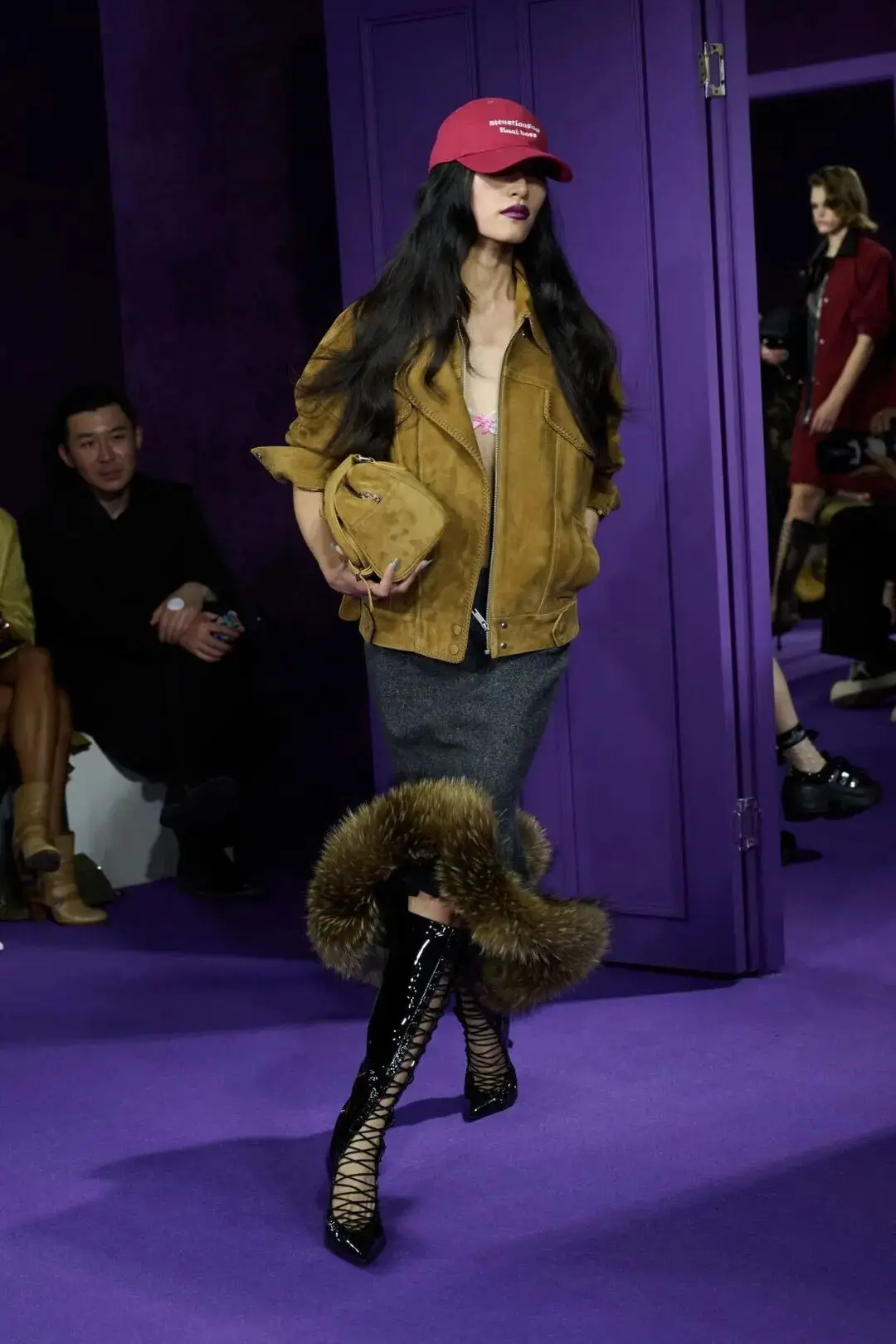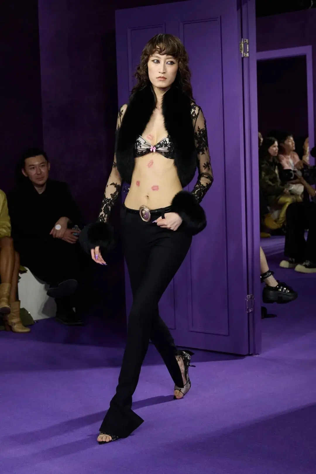 系列延续了品牌标志性的皮革与牛仔面料,并在锋芒之下增添新的层次:蕾丝与皮草大量出现,不仅自成单品,更以点缀的方式二次融入设计,在原本硬朗的轮廓上勾出挑逗的痕迹。