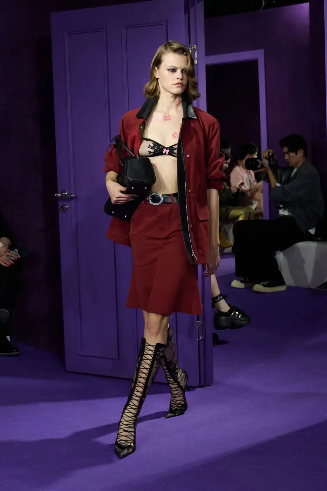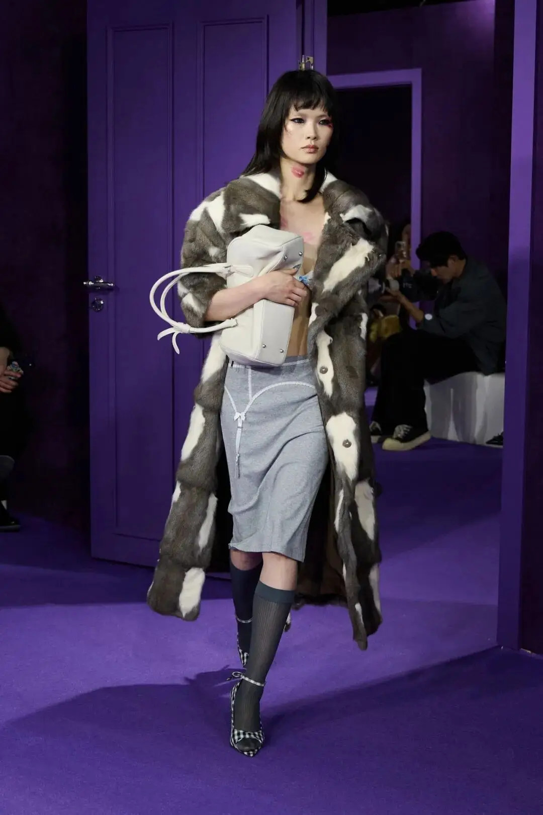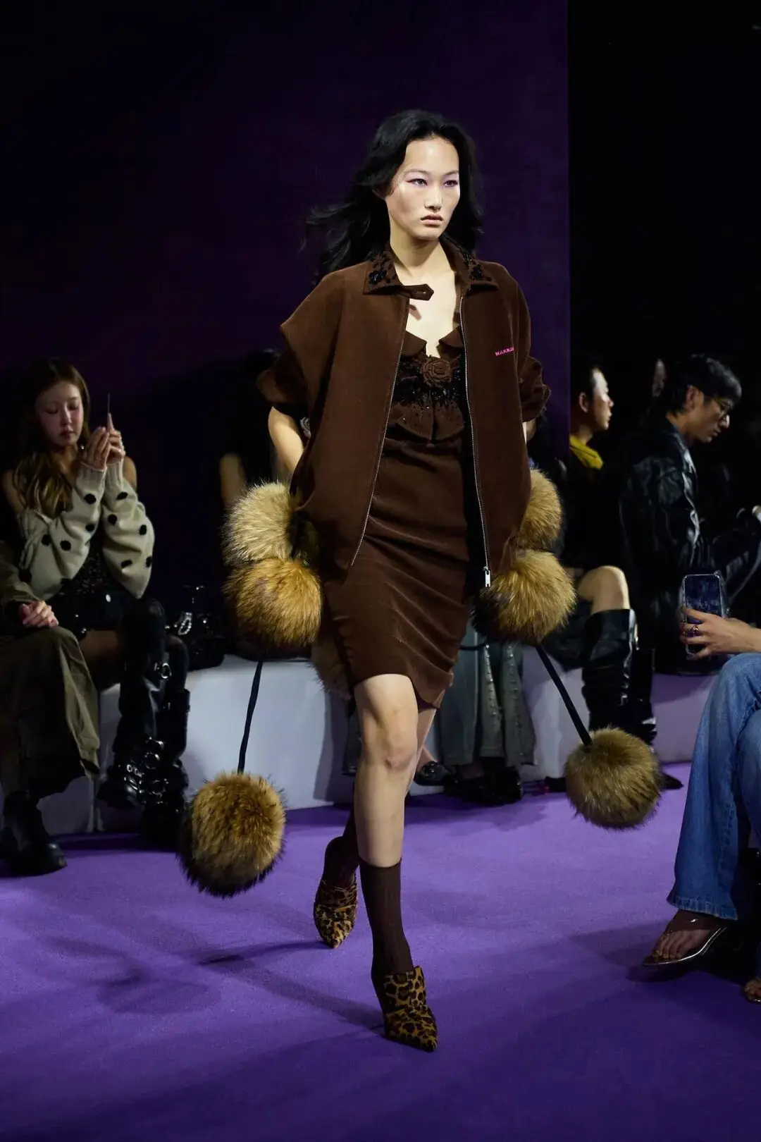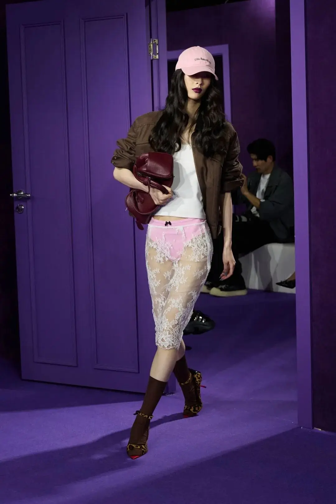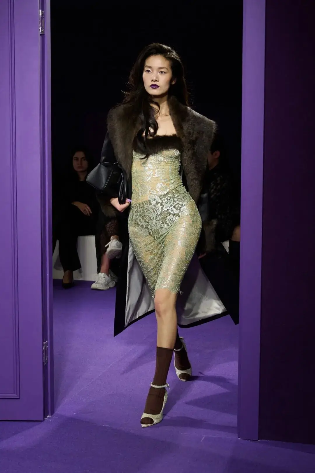 系列延续了品牌标志性的皮革与牛仔面料,并在锋芒之下增添新的层次:蕾丝与皮草大量出现,不仅自成单品,更以点缀的方式二次融入设计,在原本硬朗的轮廓上勾出挑逗的痕迹。