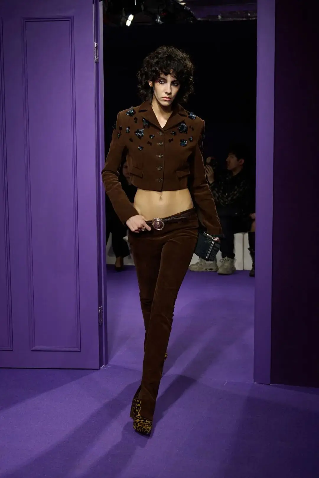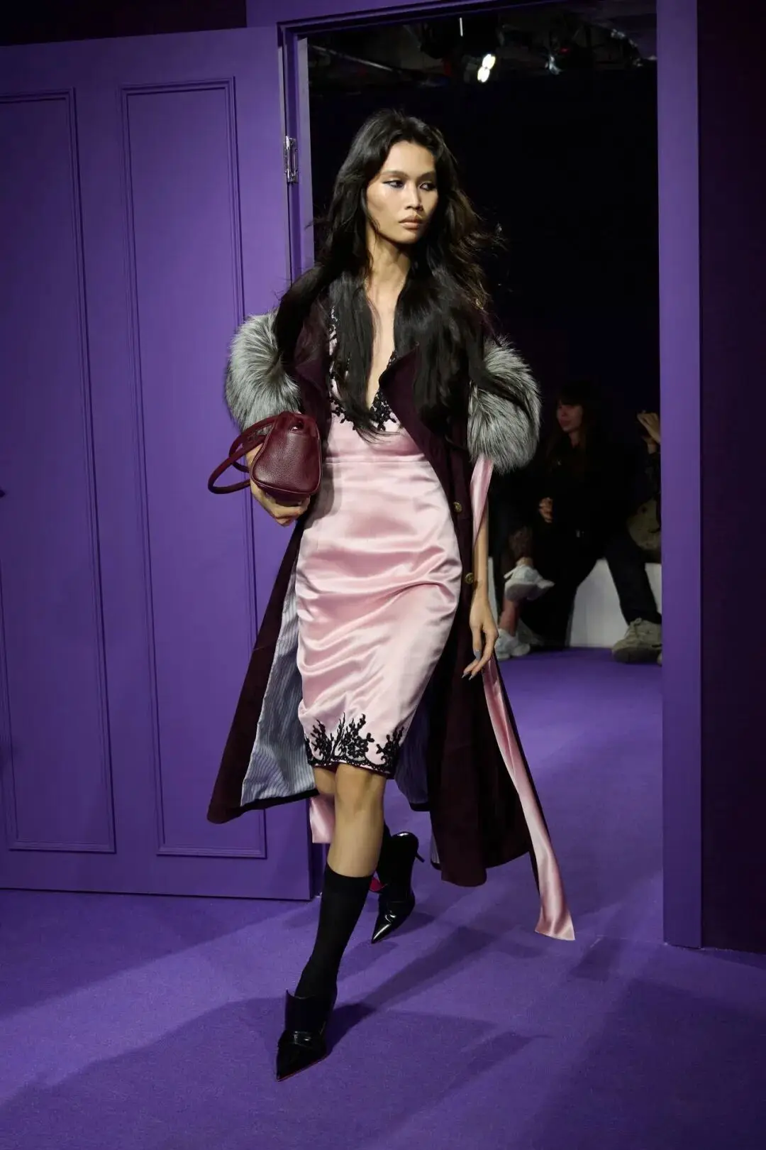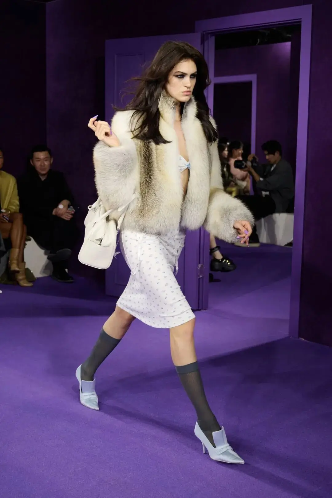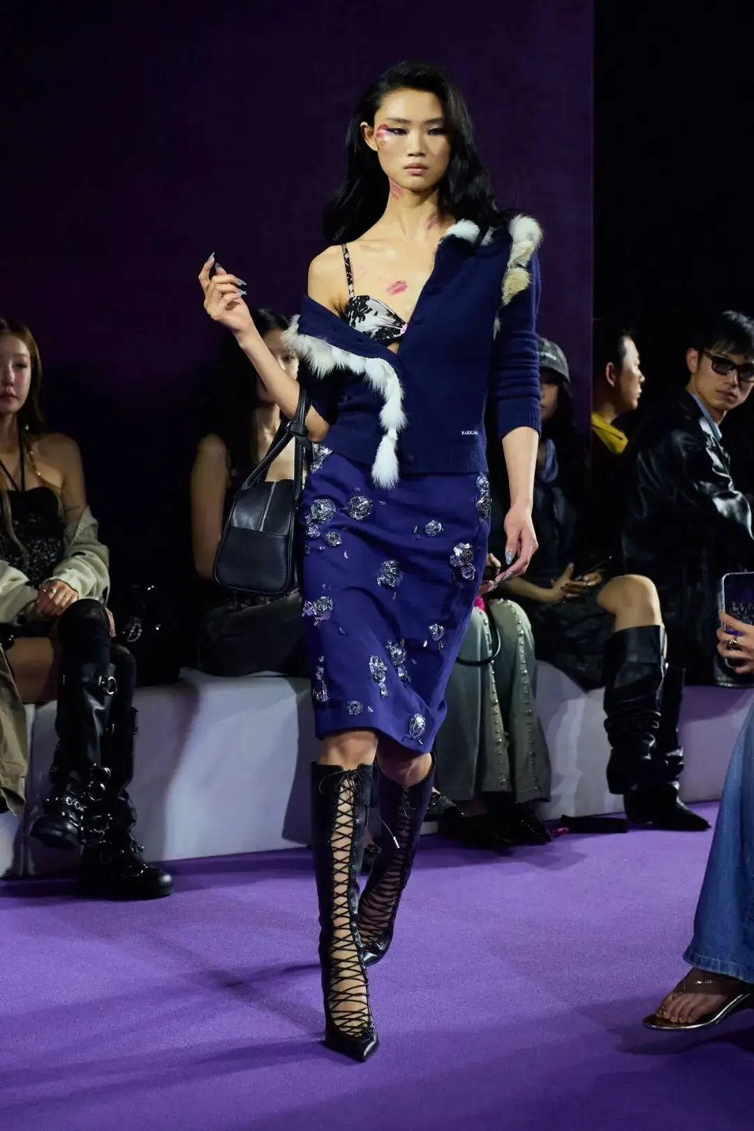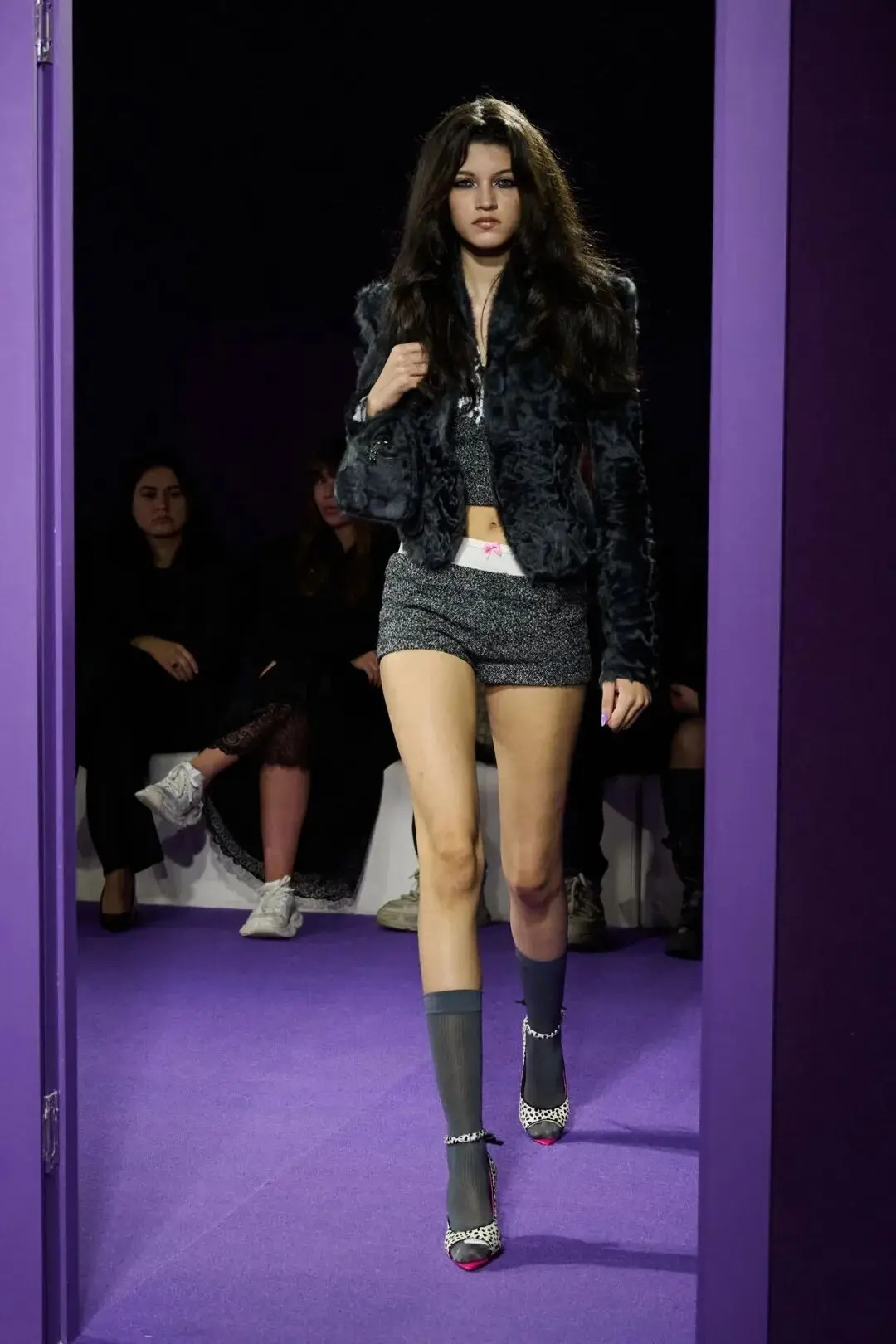 系列延续了品牌标志性的皮革与牛仔面料,并在锋芒之下增添新的层次:蕾丝与皮草大量出现,不仅自成单品,更以点缀的方式二次融入设计,在原本硬朗的轮廓上勾出挑逗的痕迹。