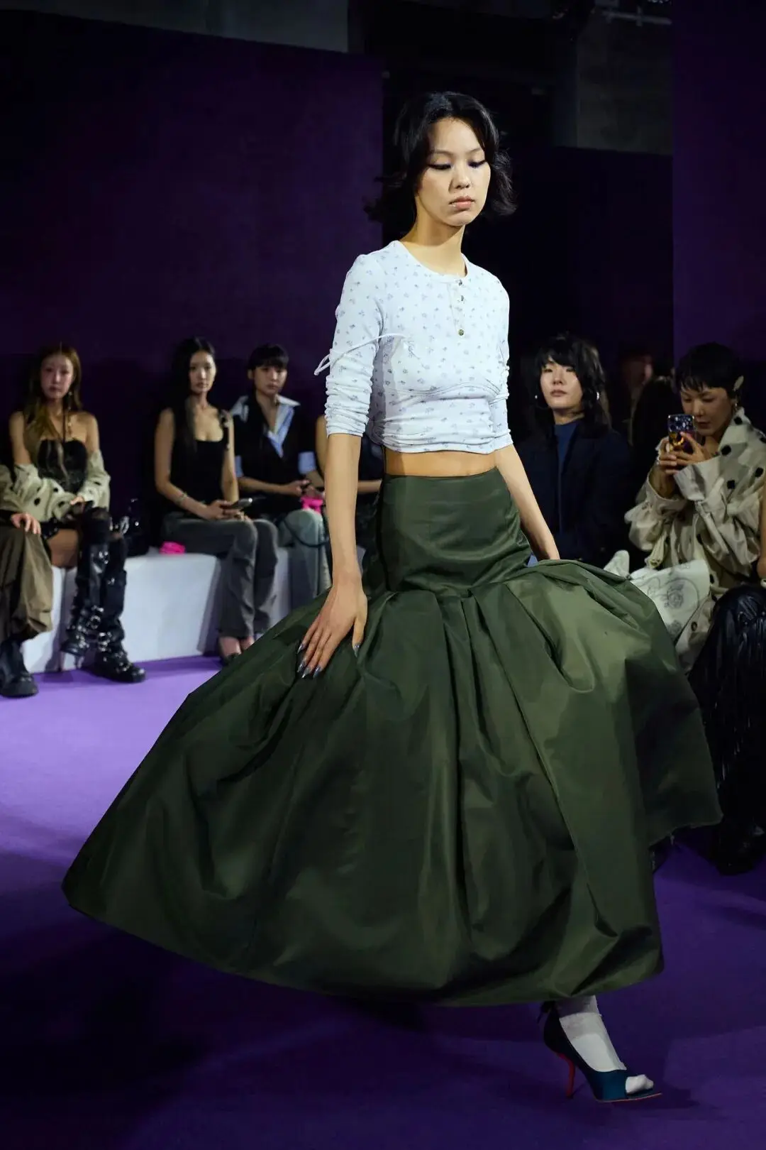 贴身剪裁贯穿全场:低腰裙裤、短款上衣、收紧胸线与利落露腹设计,让身体从"被观看"变成"主动表达",每一寸线条都在诉说自我掌控。龚子铭将轮廓收得更贴身,更强调合体与触感体验,而不是以往那些偏机能感的工装细节。