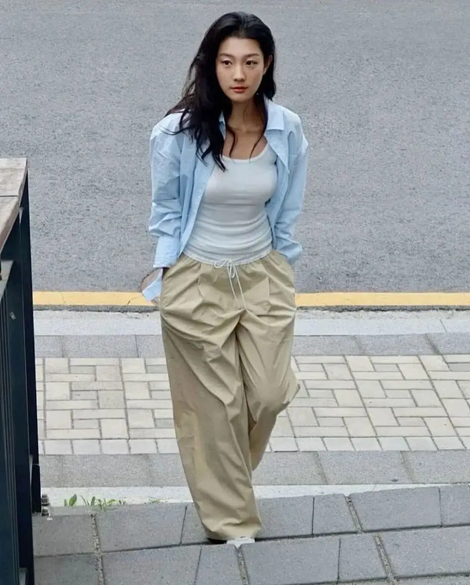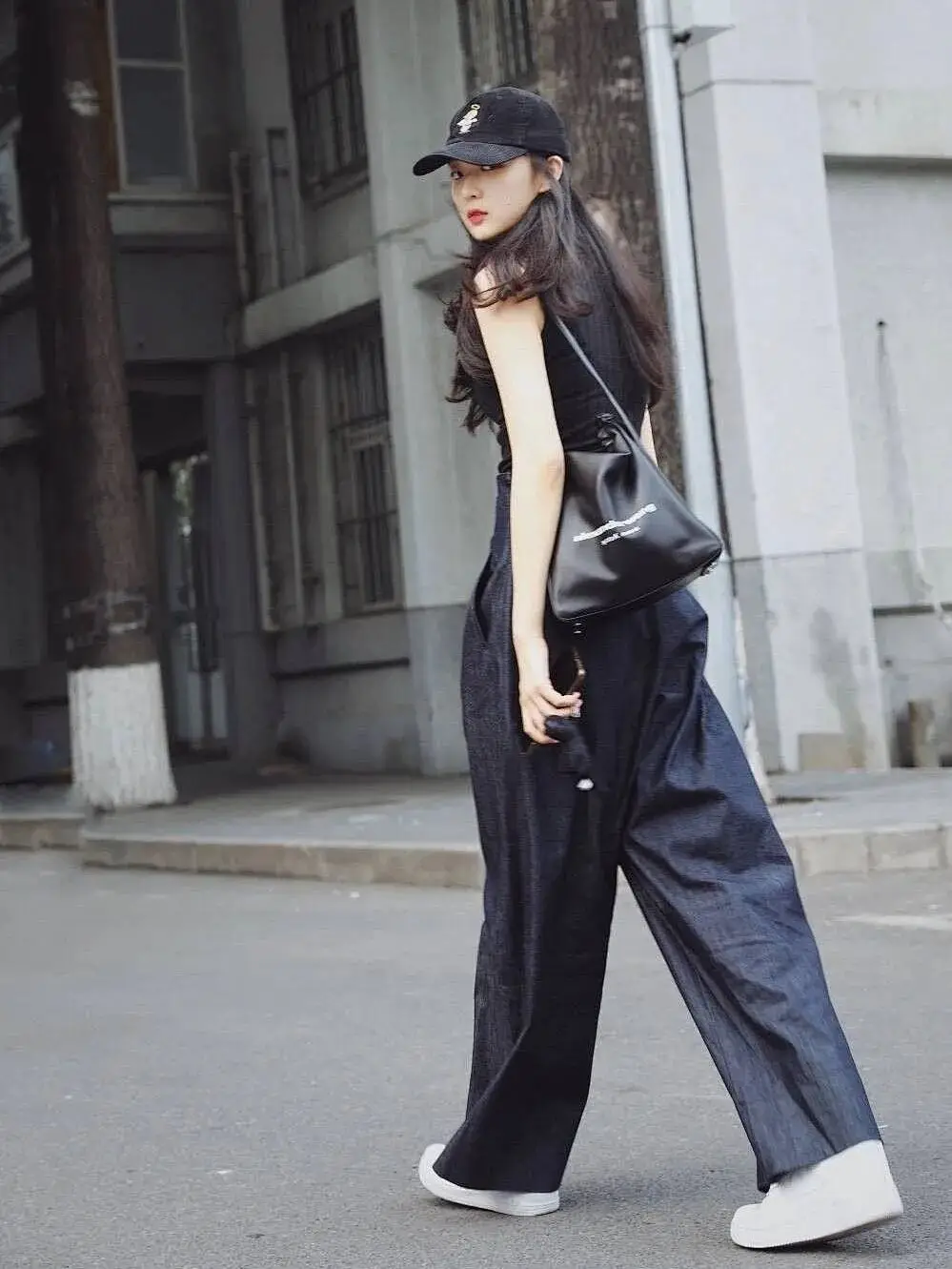 阔腿裤配薄底运动鞋,潇洒中透着少年气。