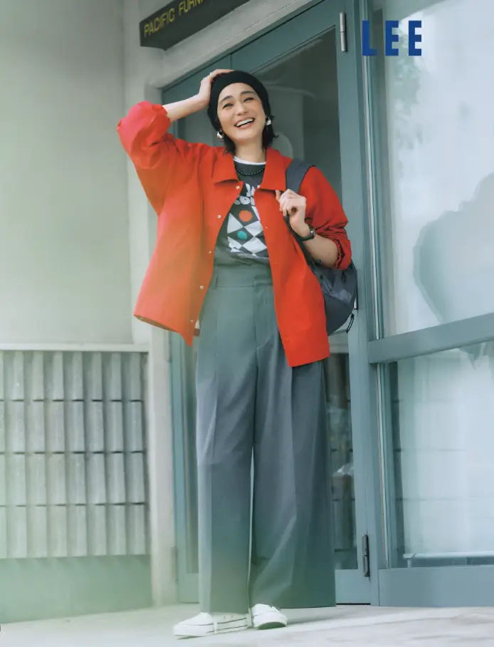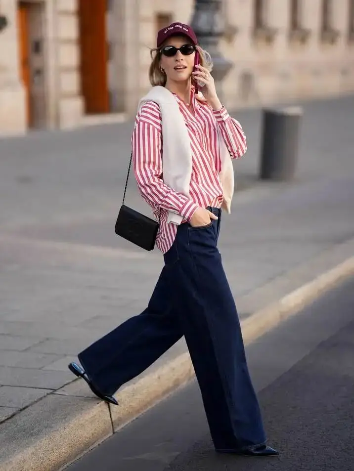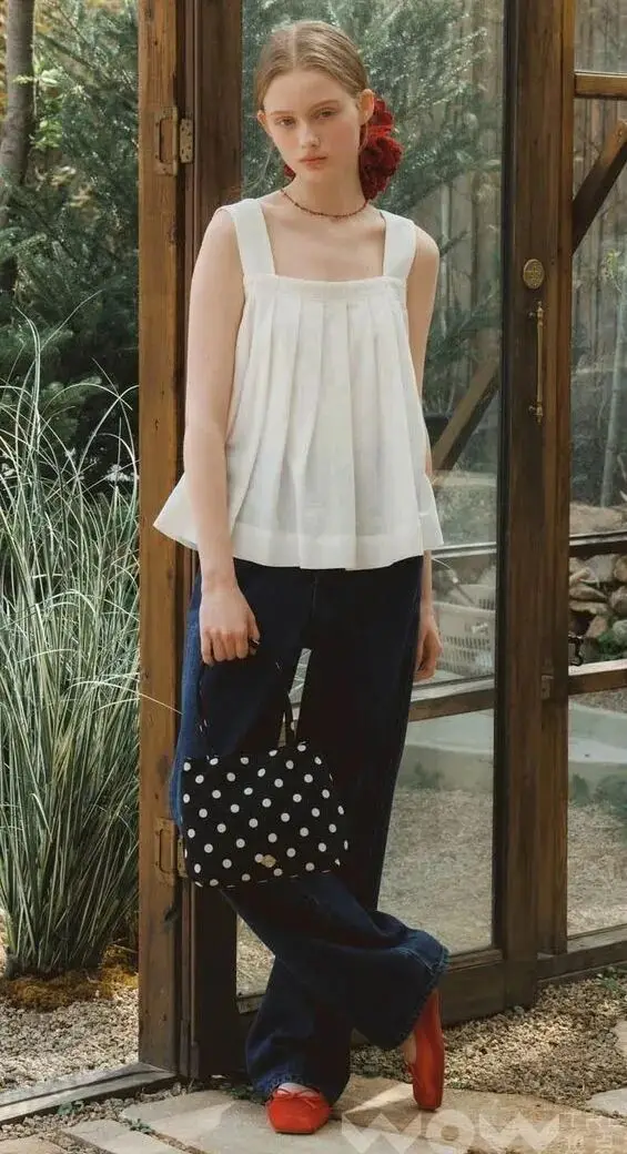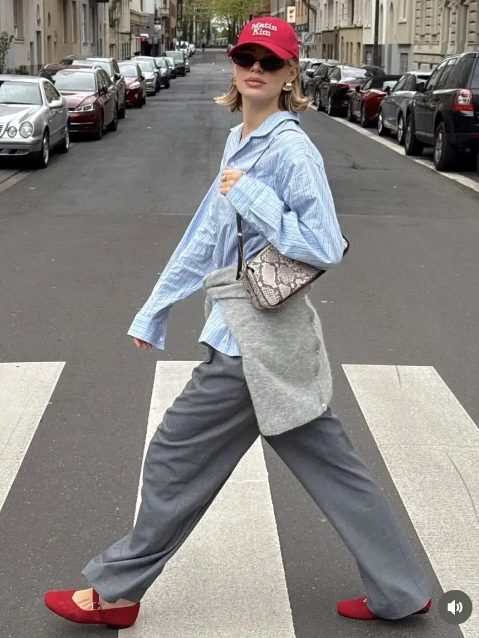 像日常的一些T恤、衬衫、POLO衫,很难穿出时髦感,但如果搭配阔腿裤+小红鞋,再呼应点缀红色包包或帽子,法式休闲的氛围便轻松拉满。
