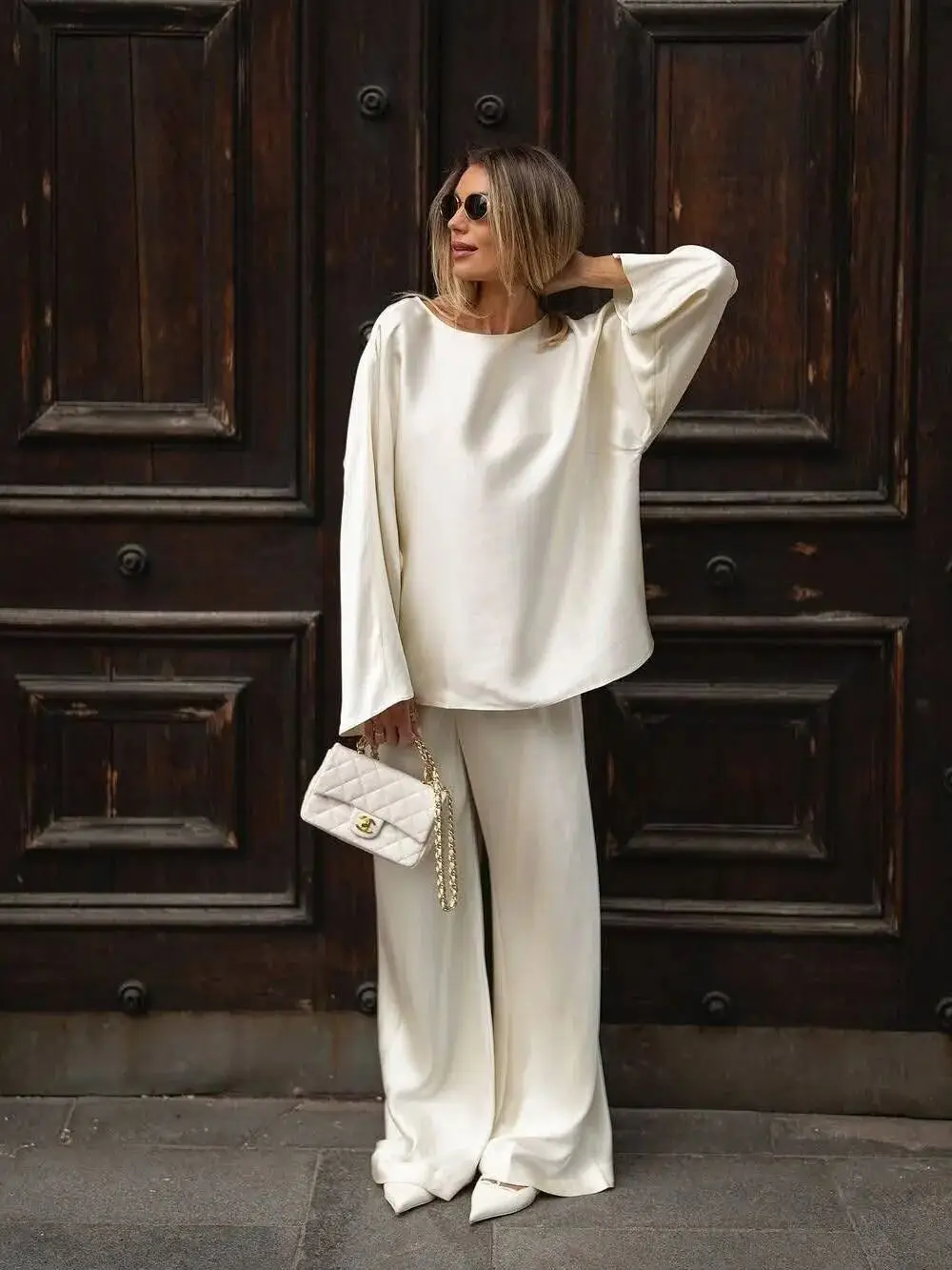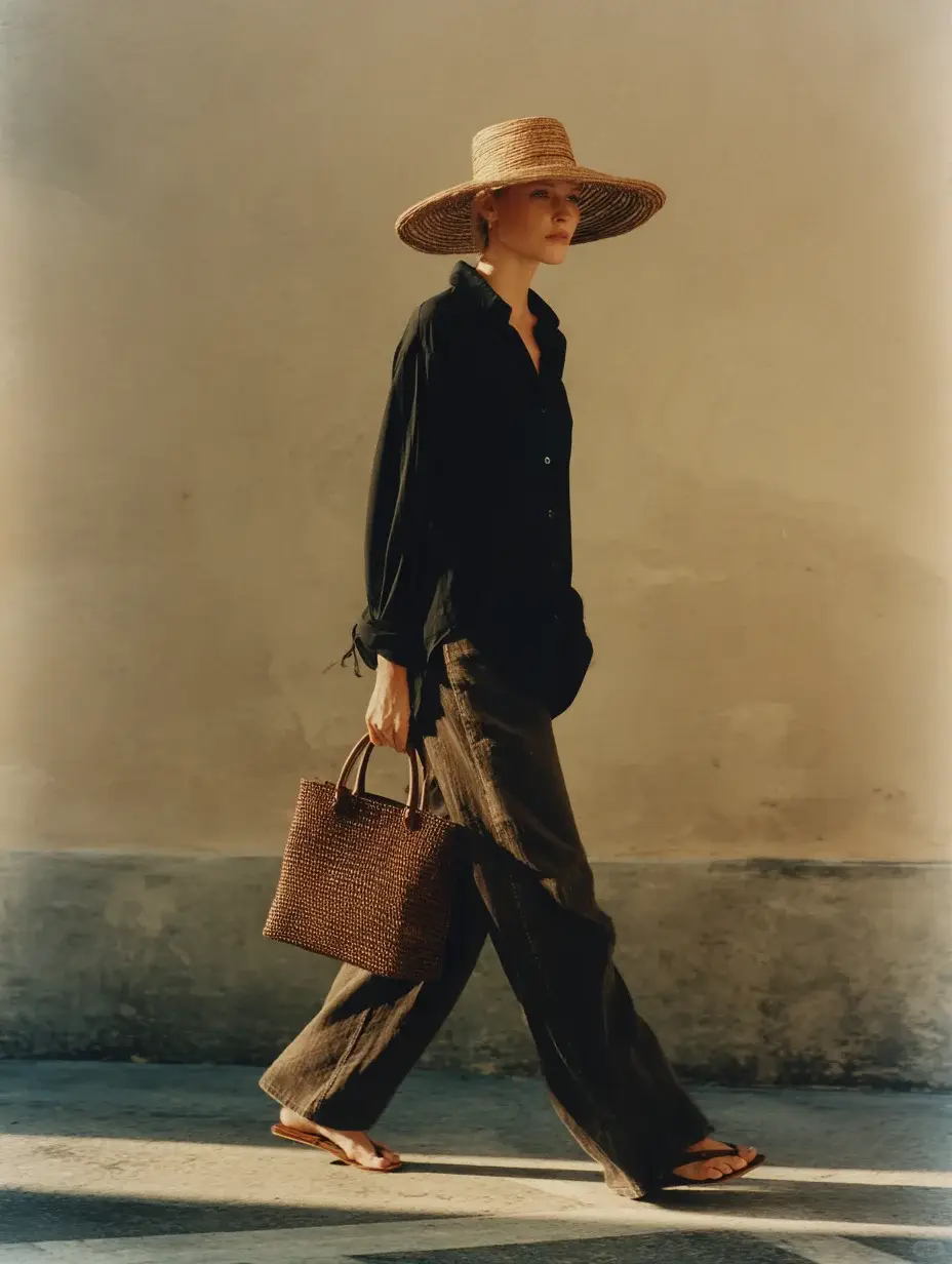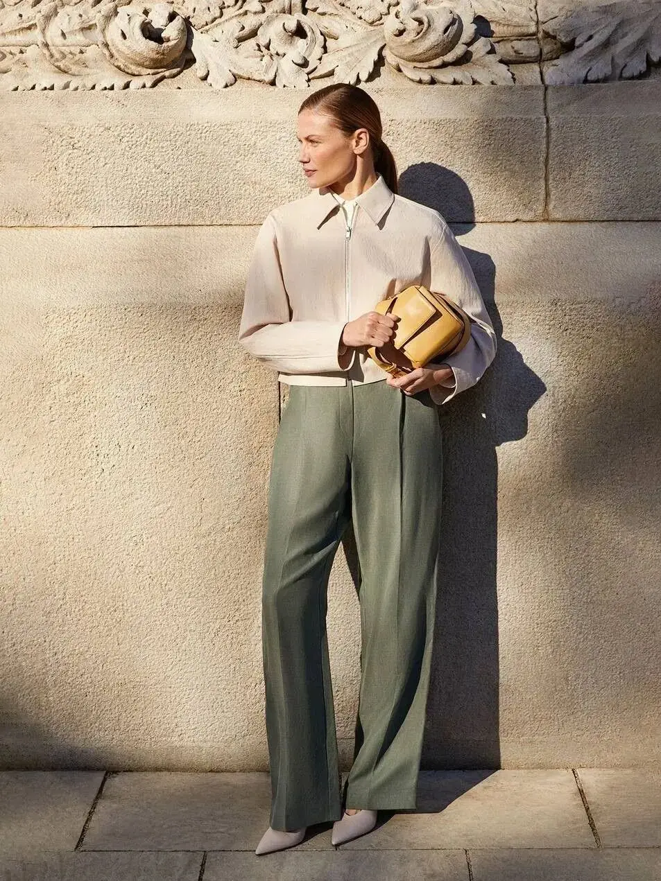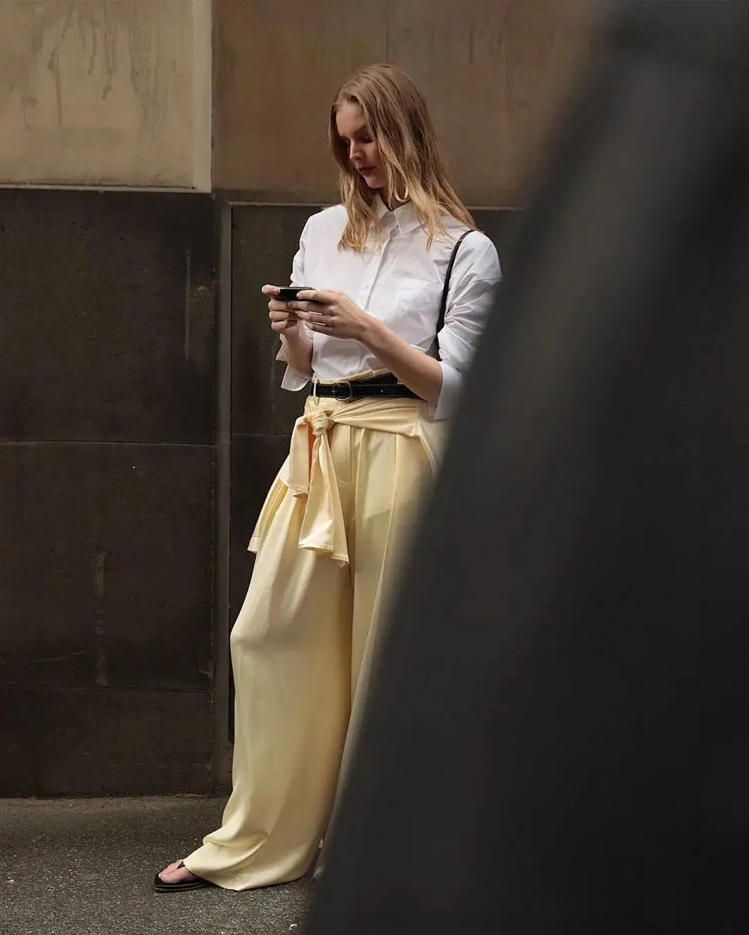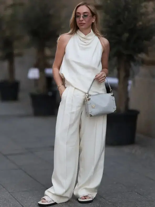 选择丝绸、醋酸、亚麻等有垂坠感的面料,能让裤线更流畅,避免产生廉价的“拖把感”。