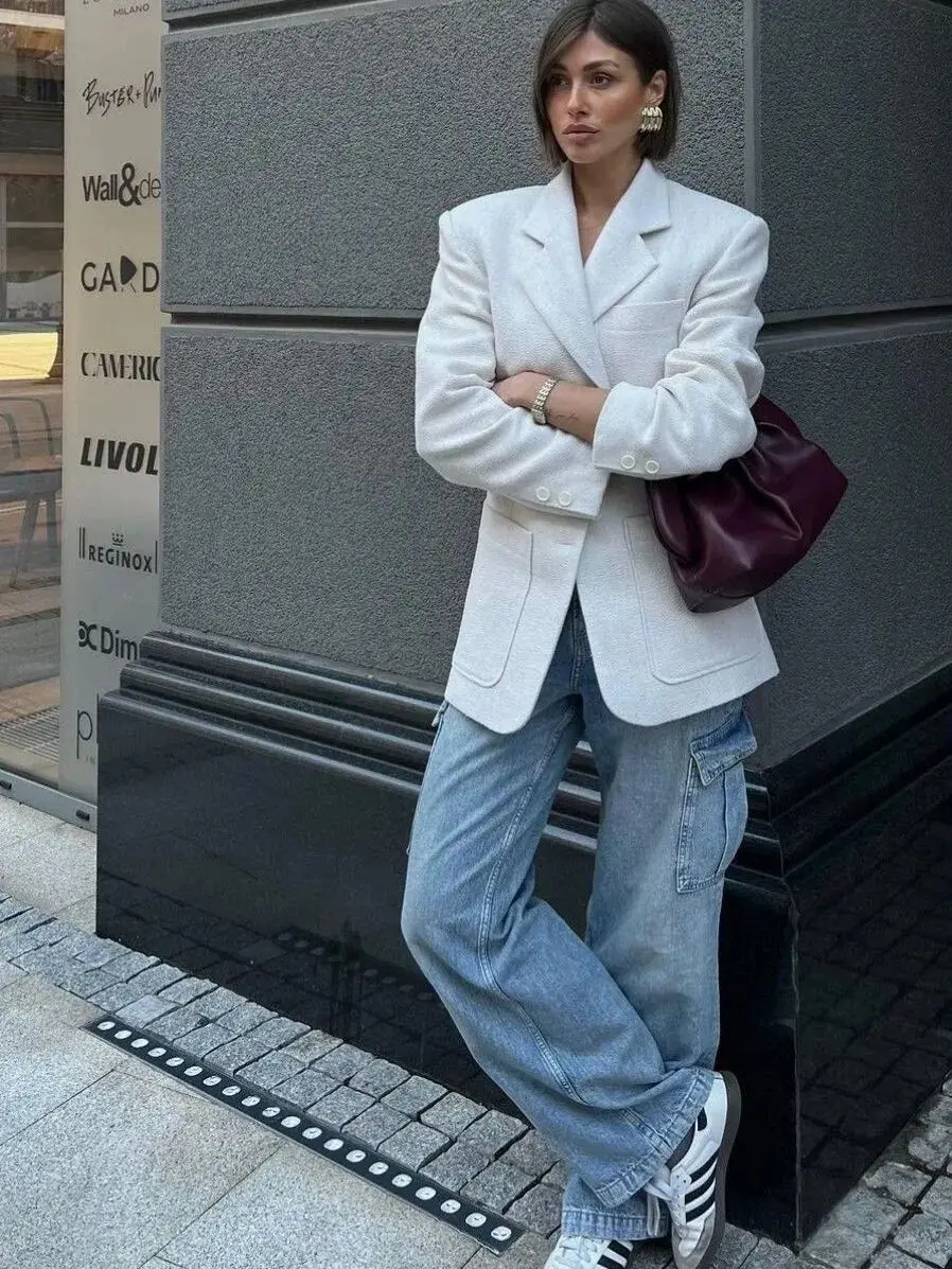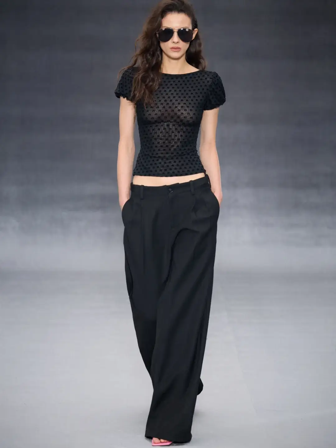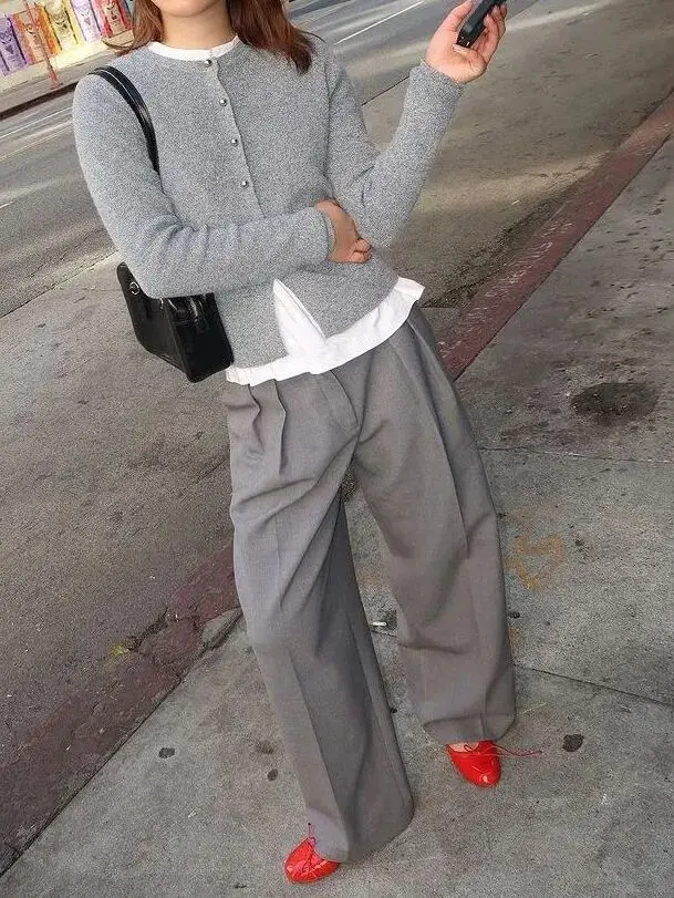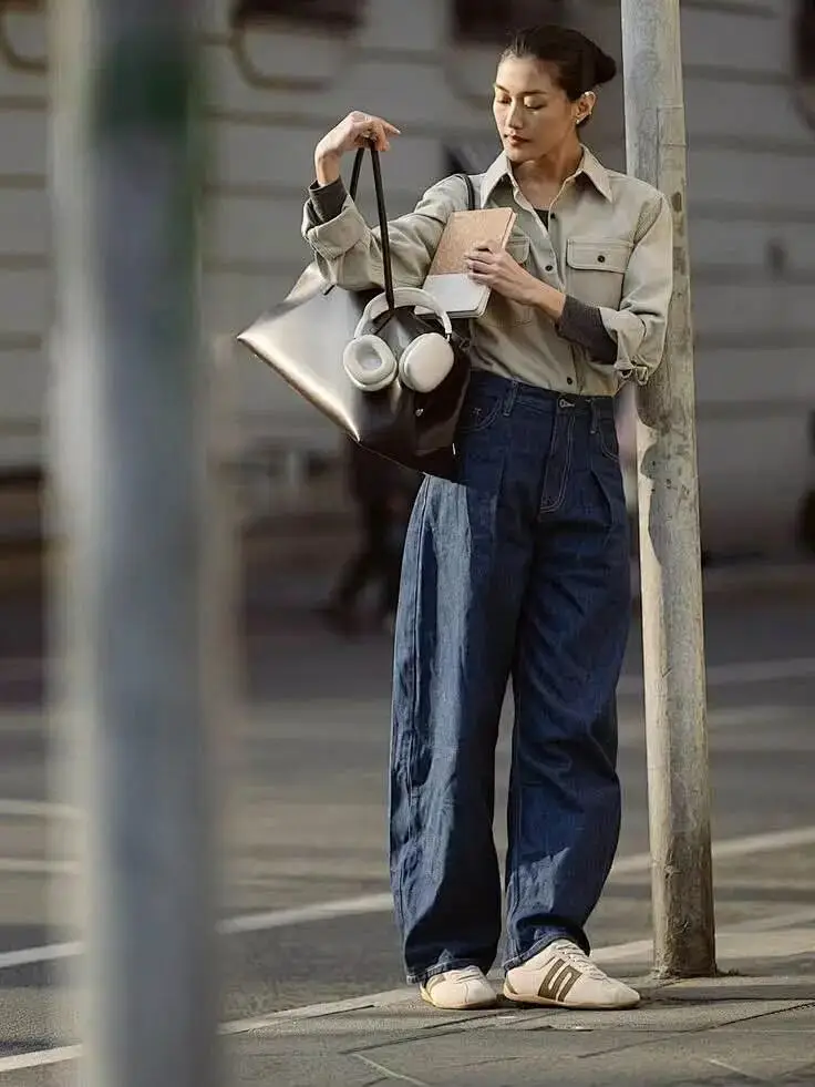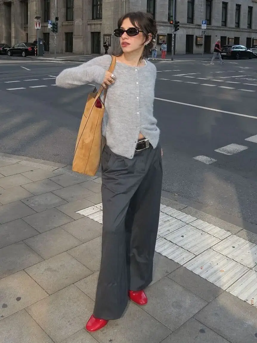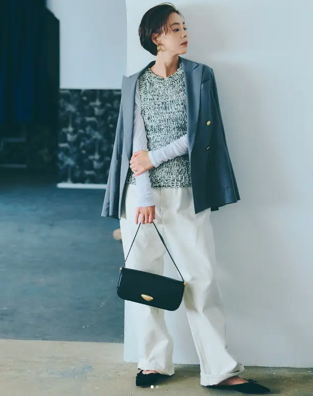 更关键的是,尖头平底鞋能巧妙平衡阔腿裤的松弛,克制而自由,非常适合通勤或优雅知性的风格。