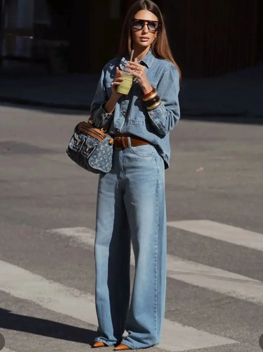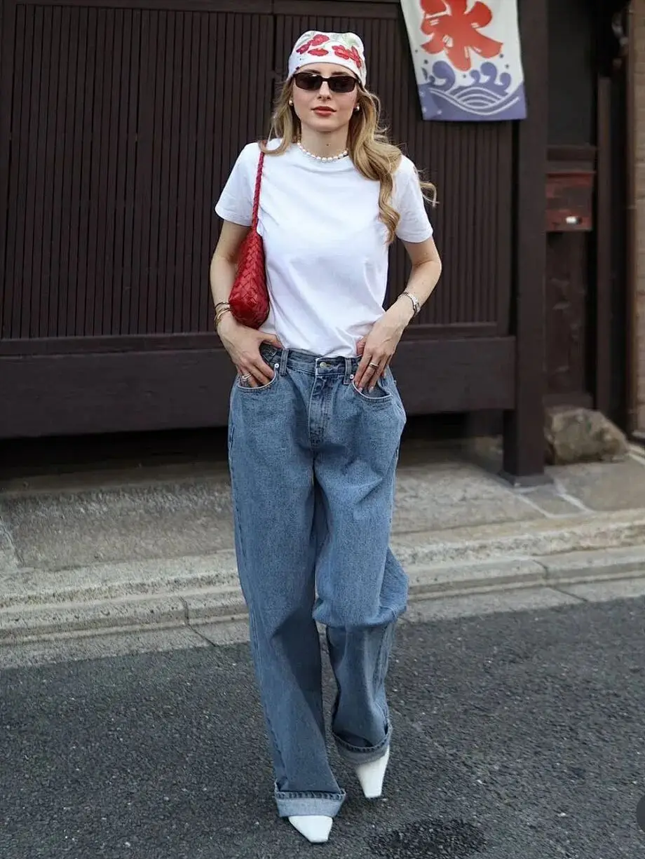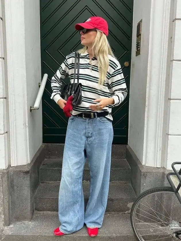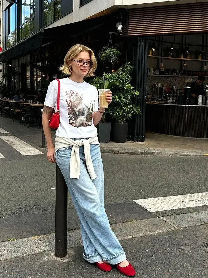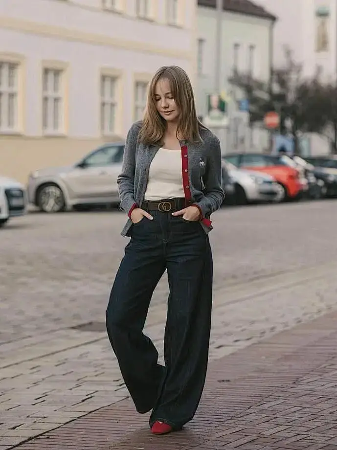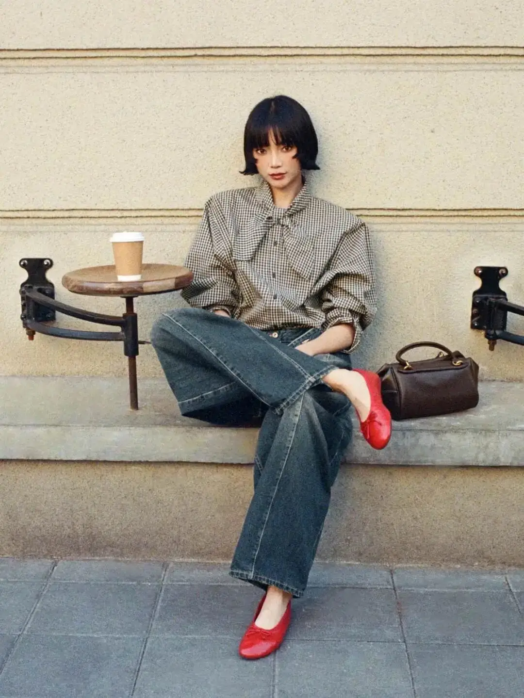 在法式女孩的搭配思路里,穿起牛仔阔腿裤时,始终会“焊”着一双小红鞋,风格辨识度极高。