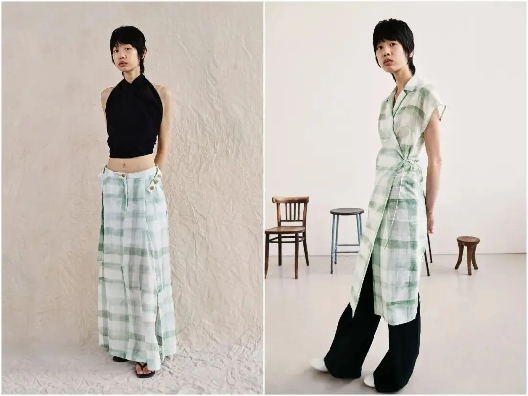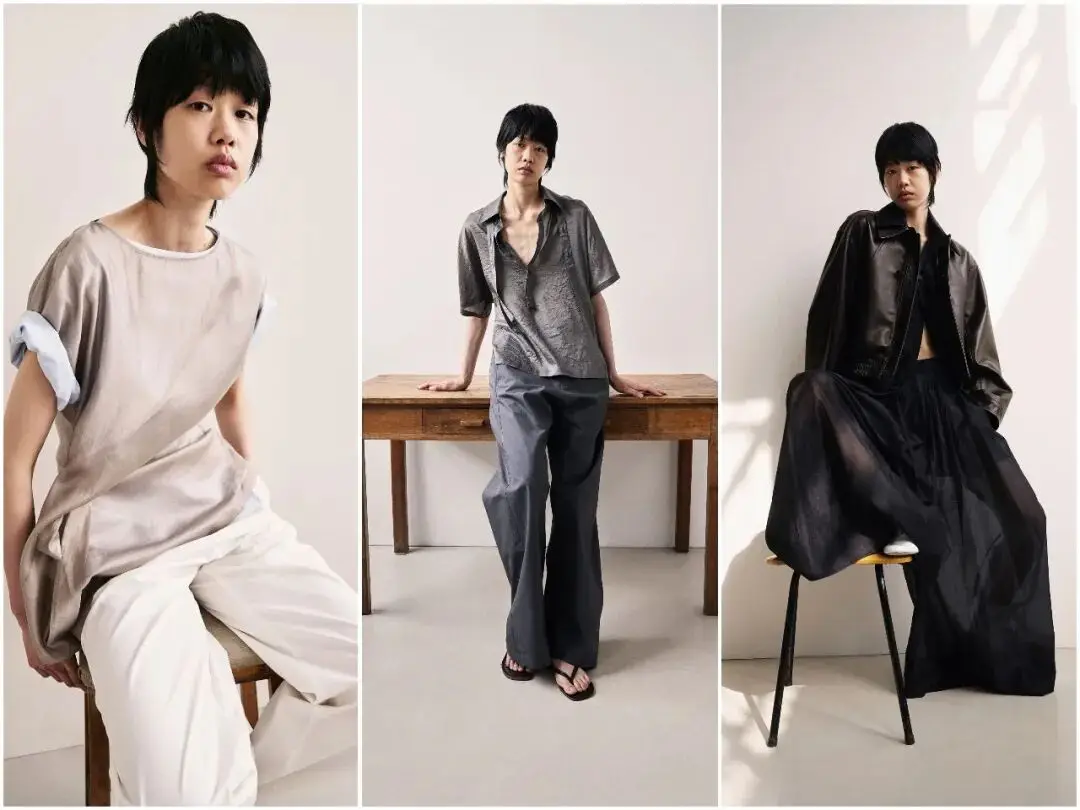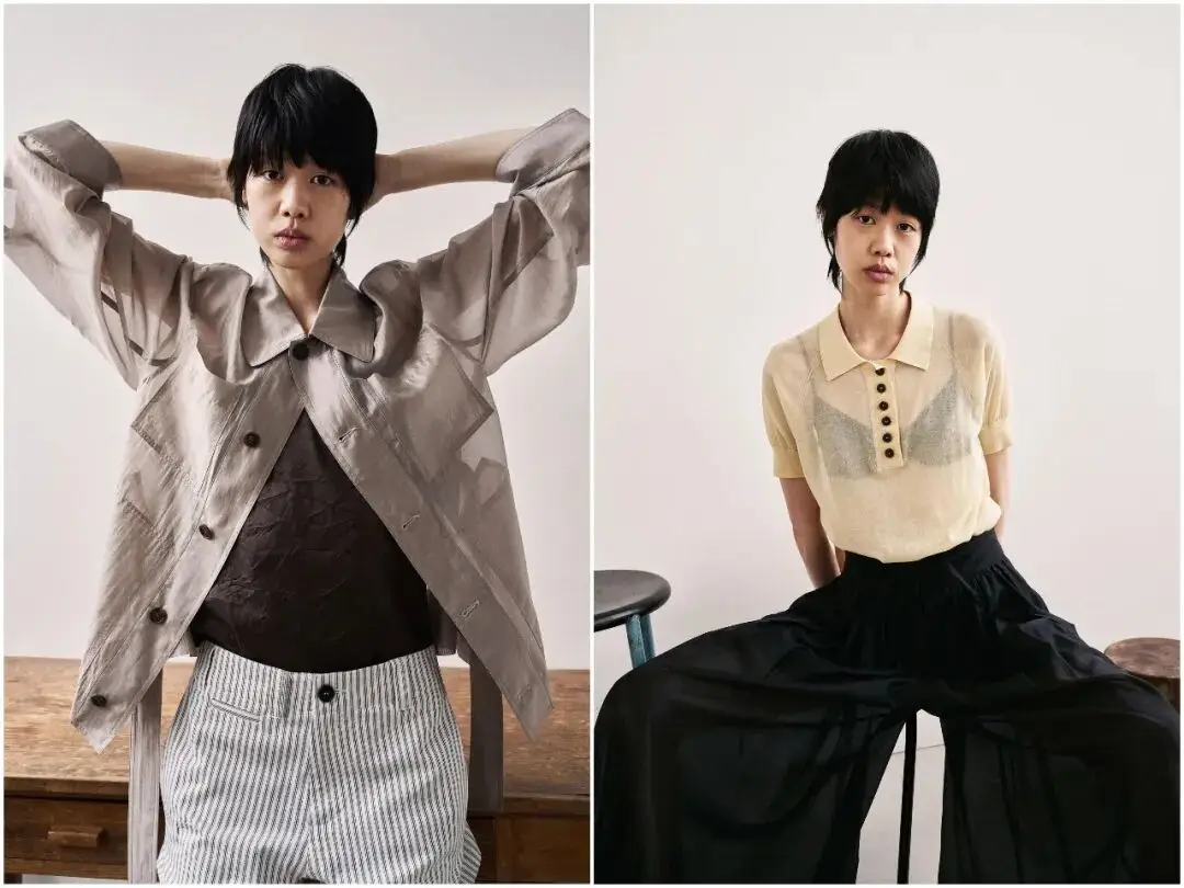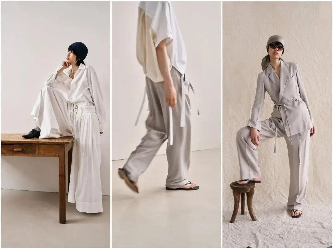 面料选择上,本季以精纺棉麻为绝对核心,融合了棉麻材质的天然透气感与精纺工艺的细腻触感,既保留了天然面料的原生肌理,又规避了传统棉麻的粗糙感。同时搭配重磅真丝、水洗棉、轻薄针织与透明欧根纱,通过面料的软硬碰撞构建丰富的视觉层次。
