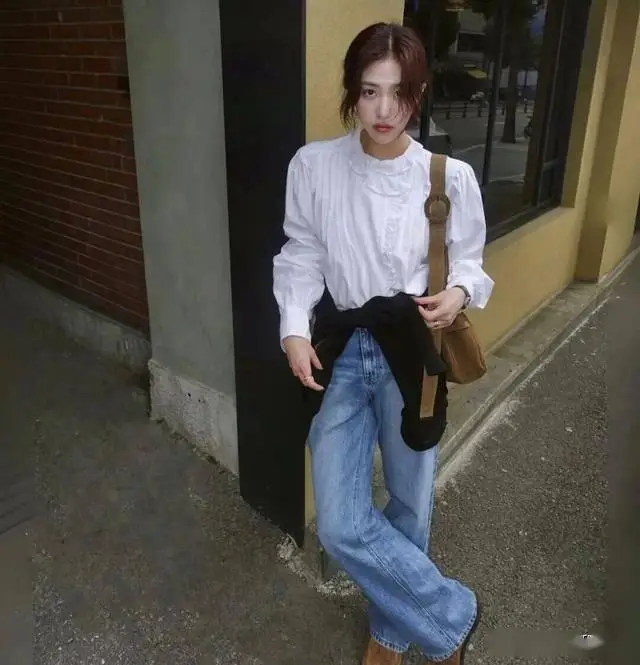 今年宫廷风的白衬衫出镜率也是非常高的,宽松一些带着慵懒的味道,配一条怀旧色的牛仔阔腿裤,带着复古感,又觉得摩登。