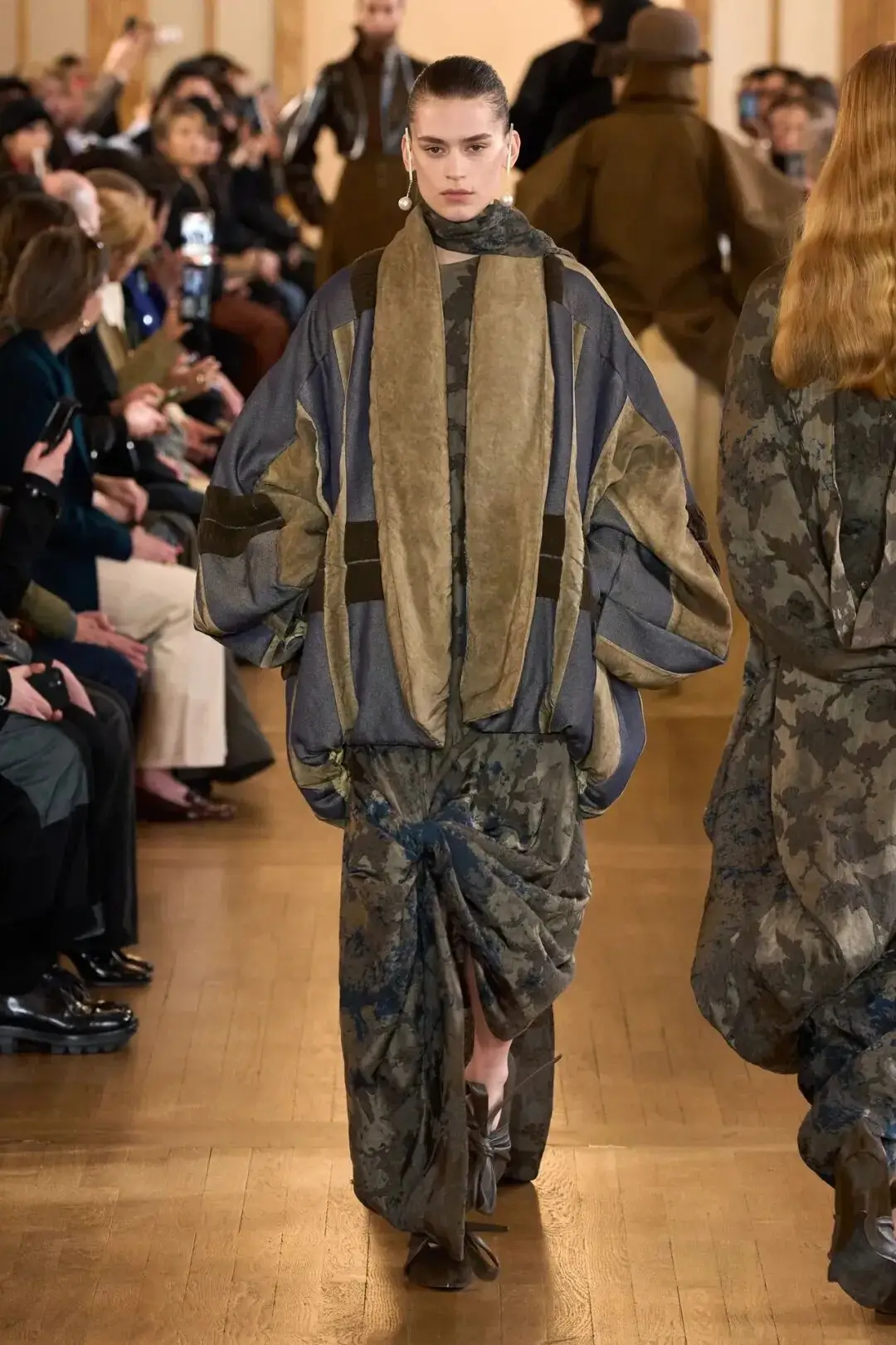 面料的淬炼:品牌标志性的极致面料探索在此延续。重磅羊毛、亚麻与奢华提花织物,通过创新的反向提花工艺,呈现出独特的肌理与光泽。锦缎的华贵、天鹅绒的温润、皮革的光泽,与经过特殊处理的做旧质感面料并存,仿佛衣物本身已历经时光浸润,诉说着故事。