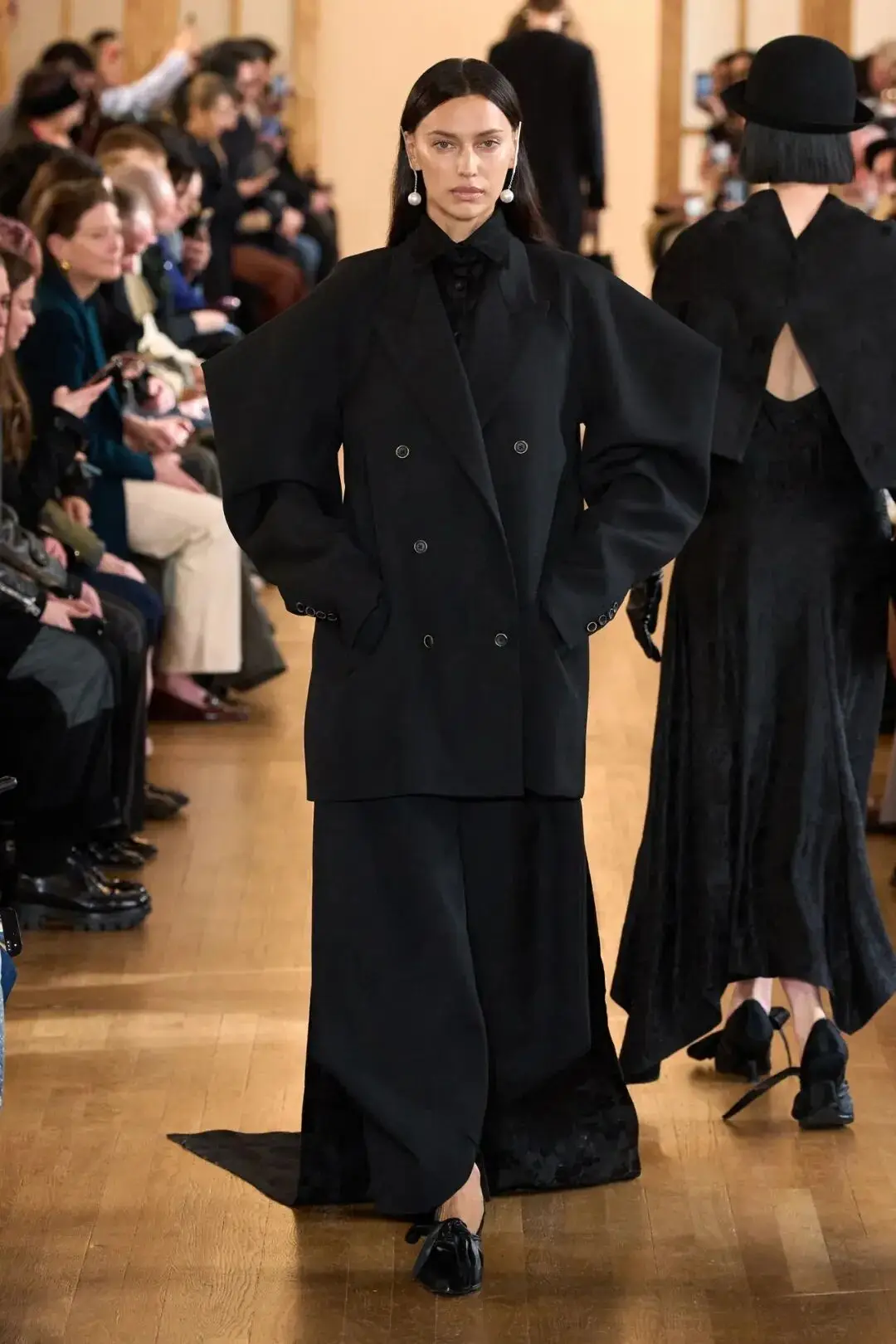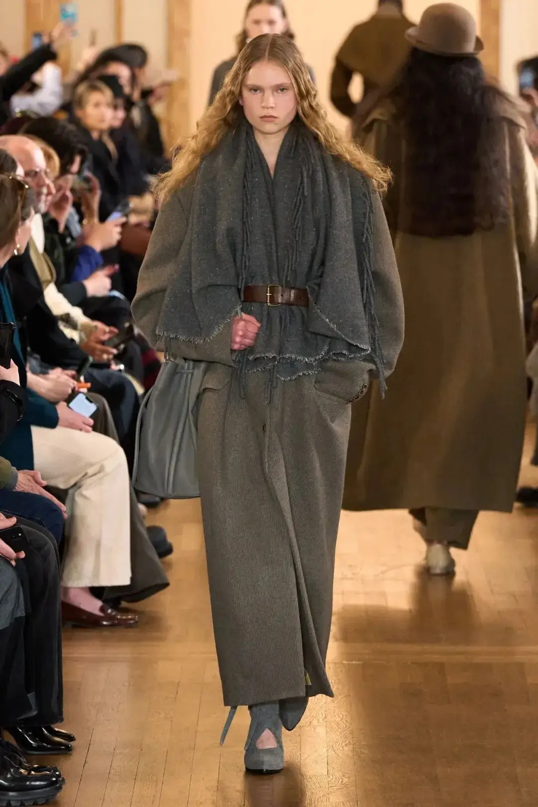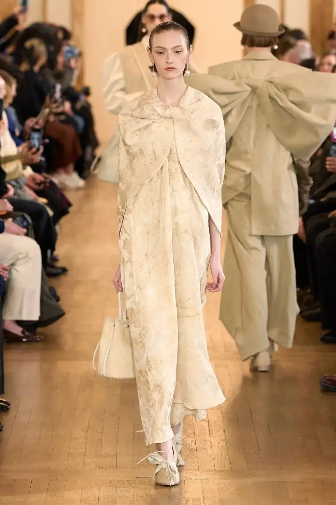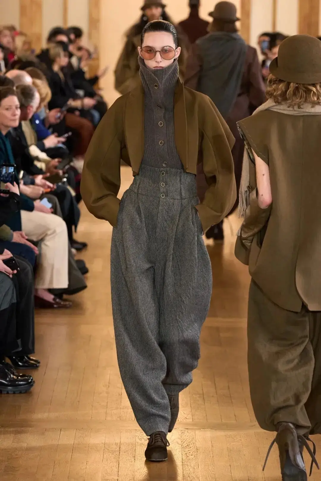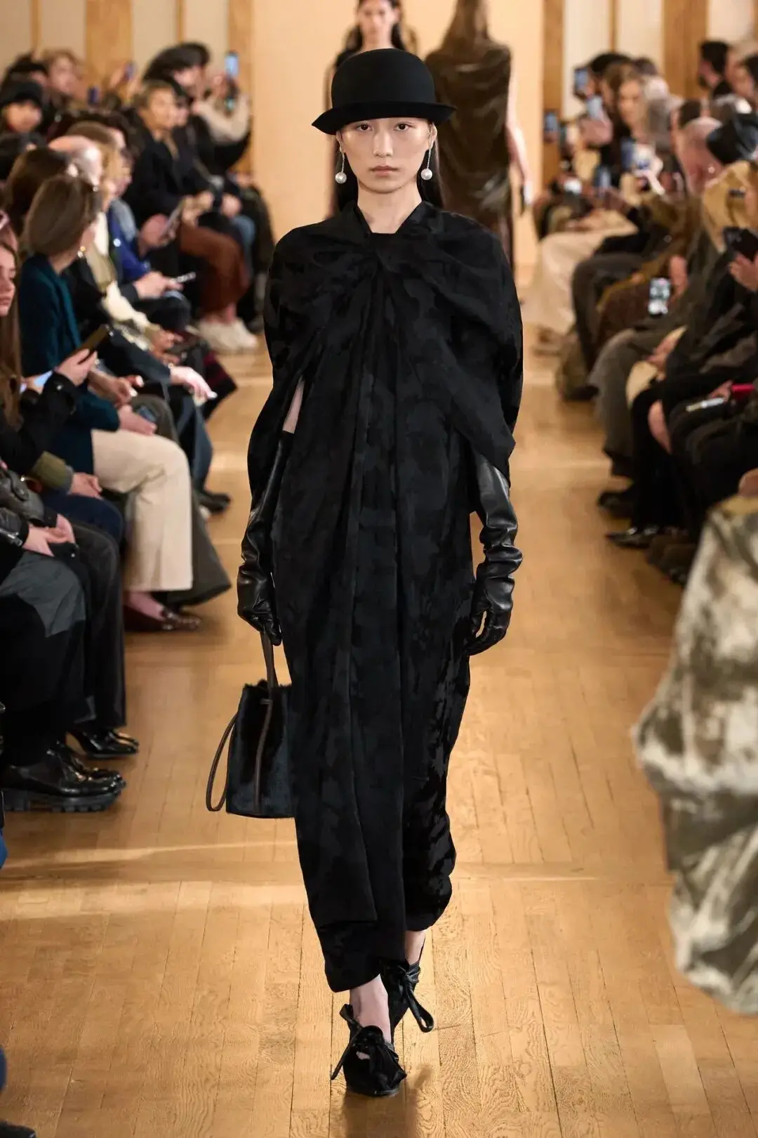 雕塑般的轮廓:受竞技场宏伟结构的启发,宽肩、利落的夹克与大衣被塑造出夸张的斜角与曲线,如同被时光打磨的巨石,充满体积感与稳定性。层叠的垂褶、不对称的剪裁,在身体上构建出流动的建筑线条。