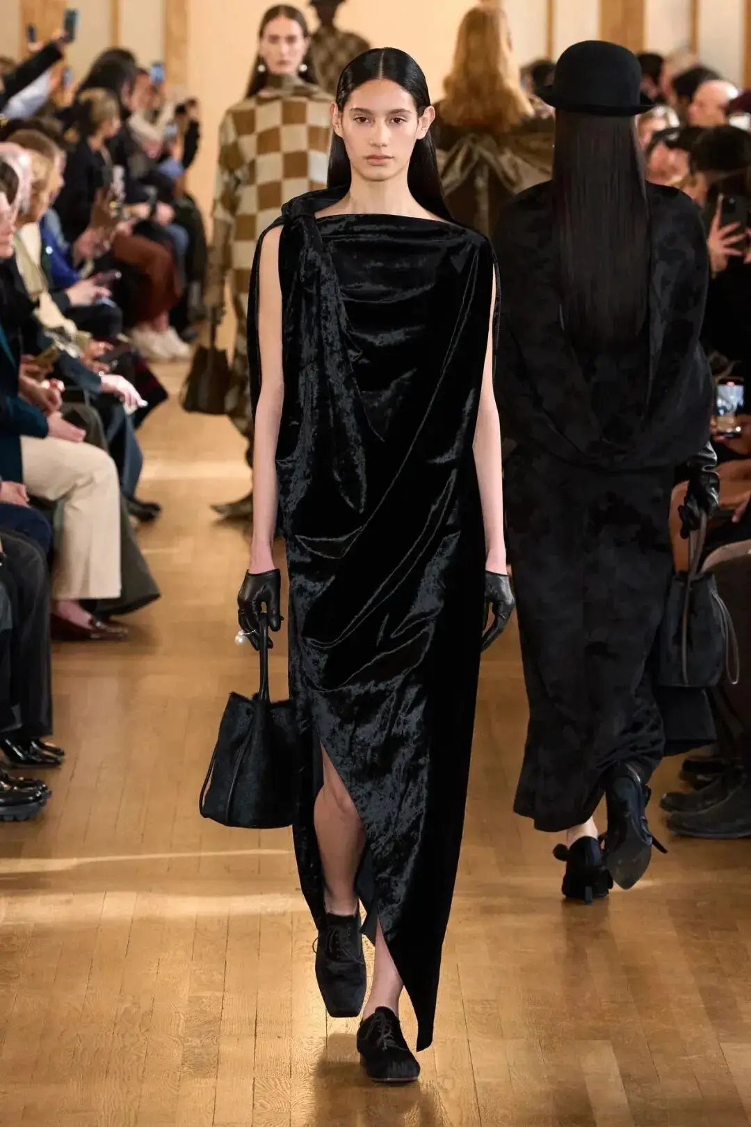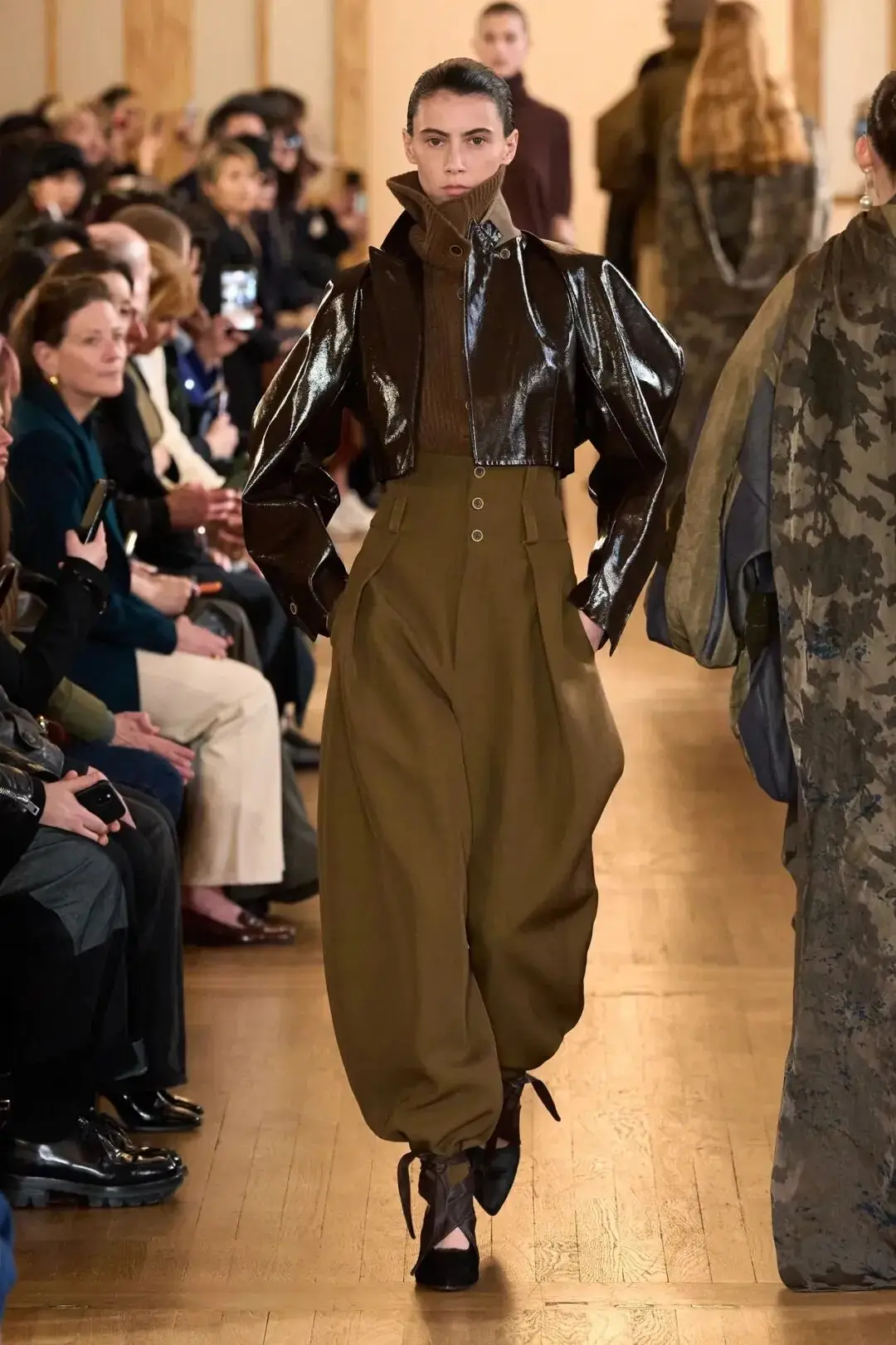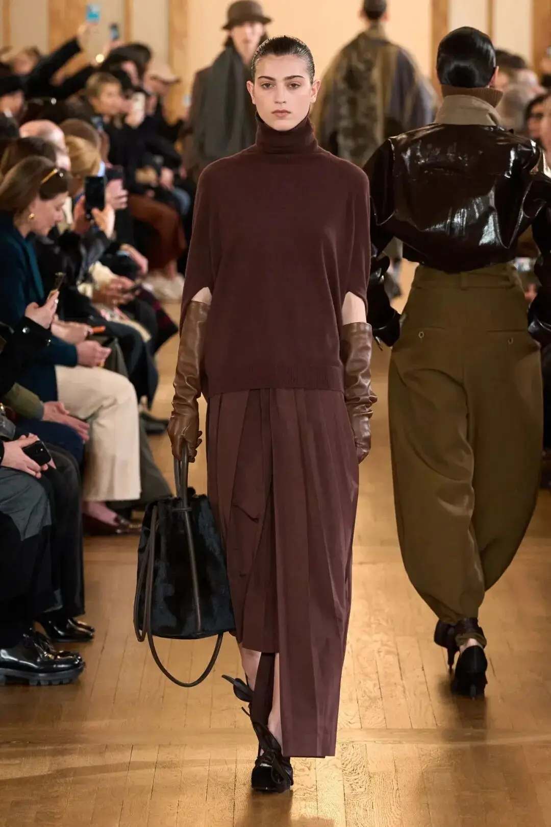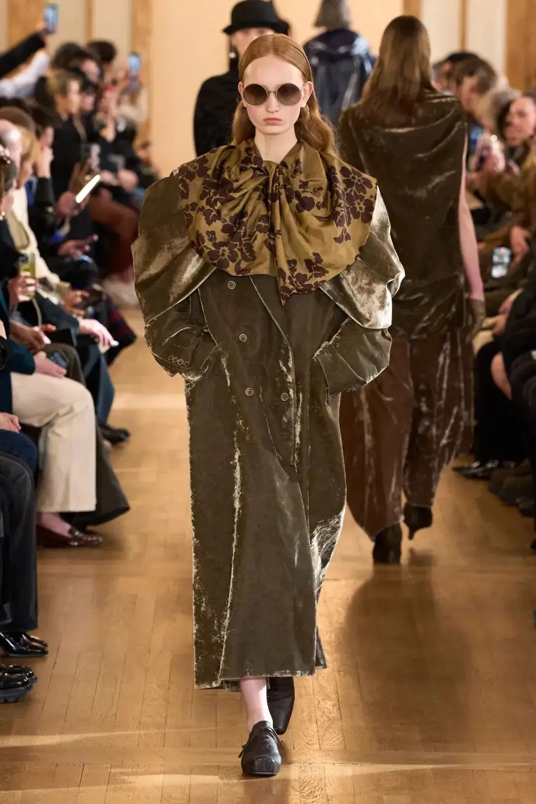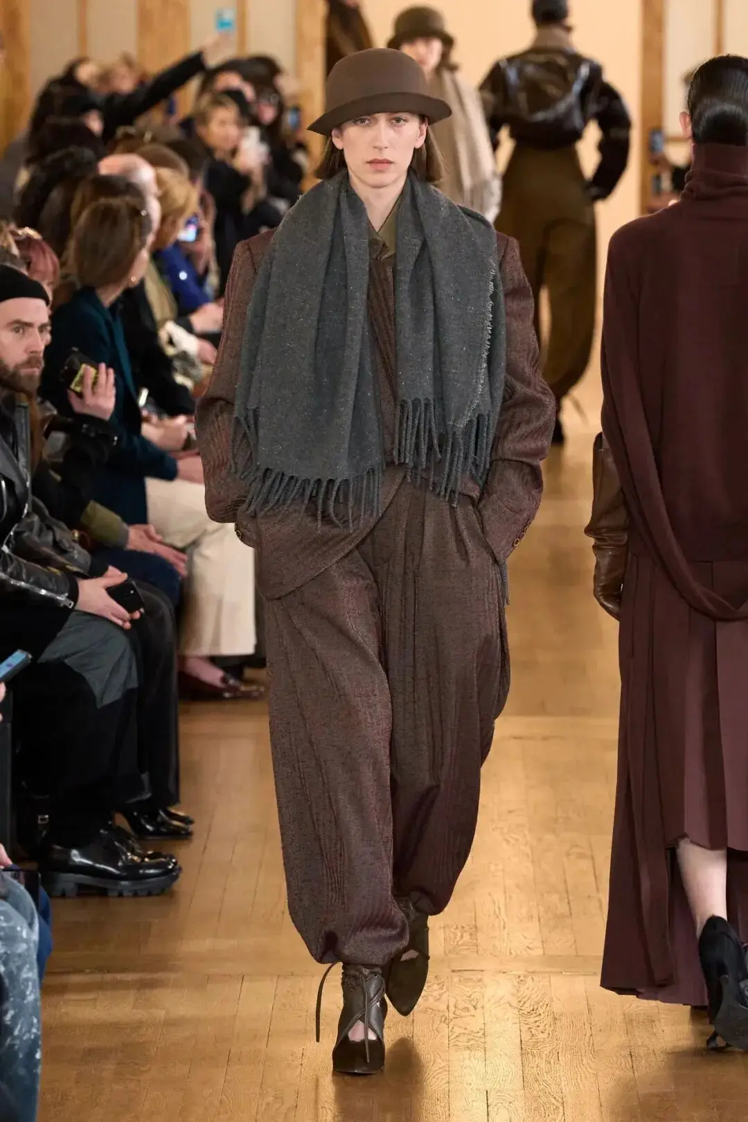 雕塑般的轮廓:受竞技场宏伟结构的启发,宽肩、利落的夹克与大衣被塑造出夸张的斜角与曲线,如同被时光打磨的巨石,充满体积感与稳定性。层叠的垂褶、不对称的剪裁,在身体上构建出流动的建筑线条。