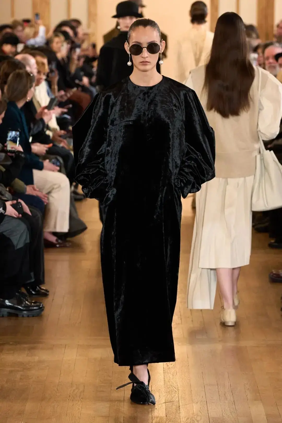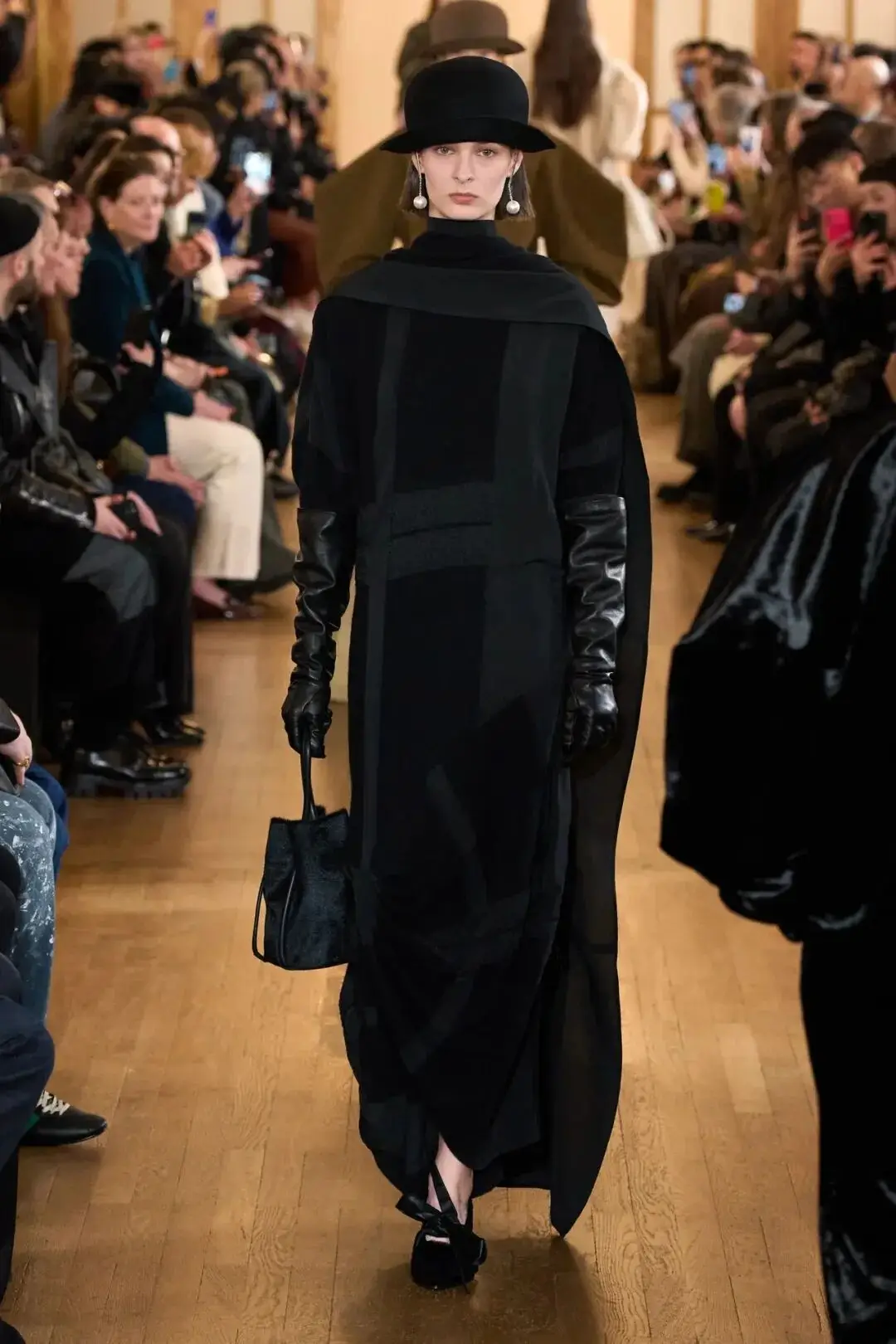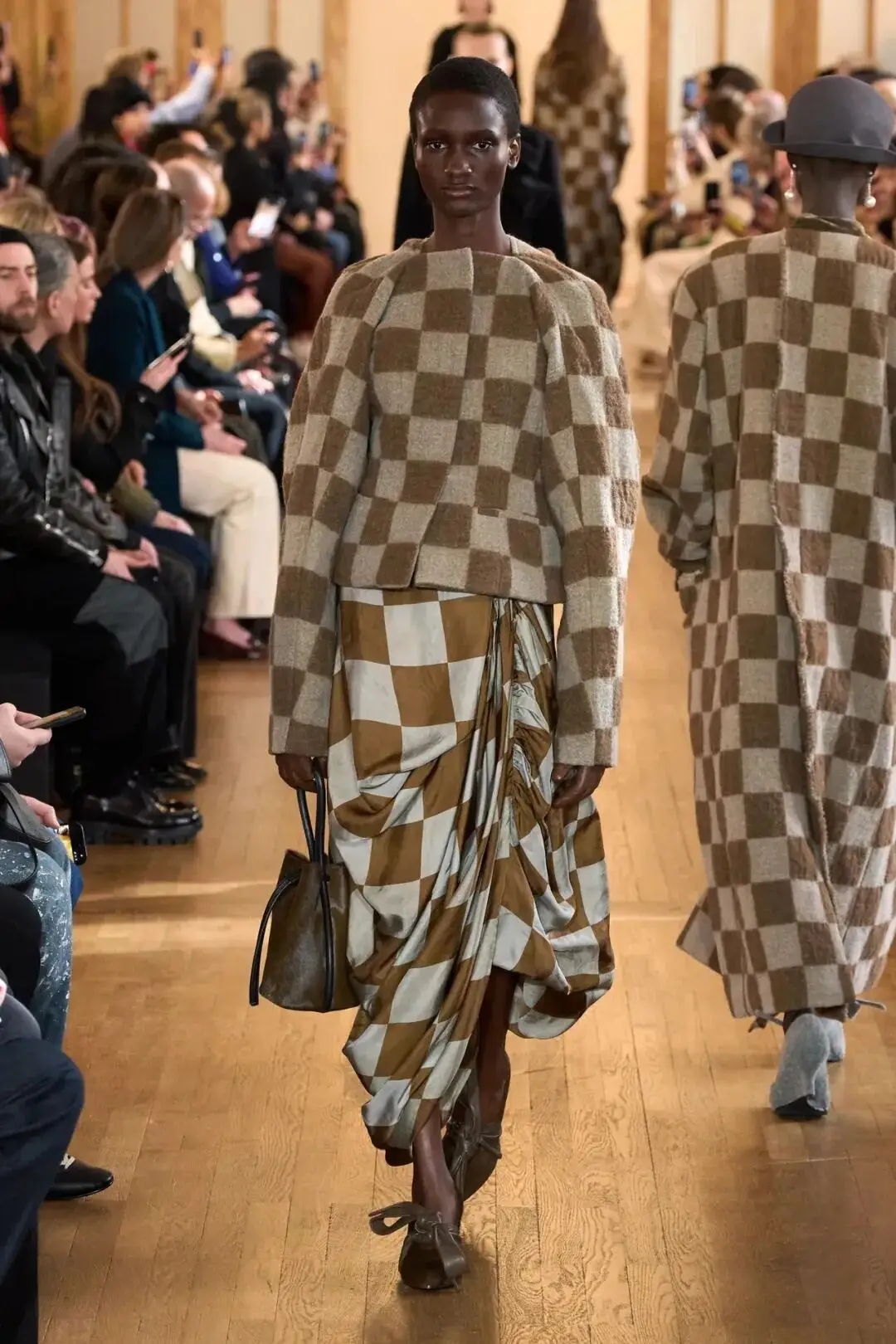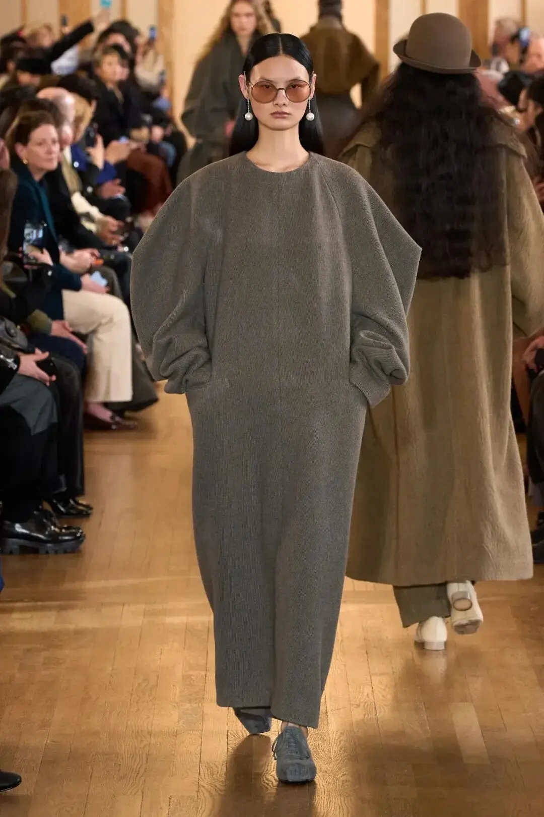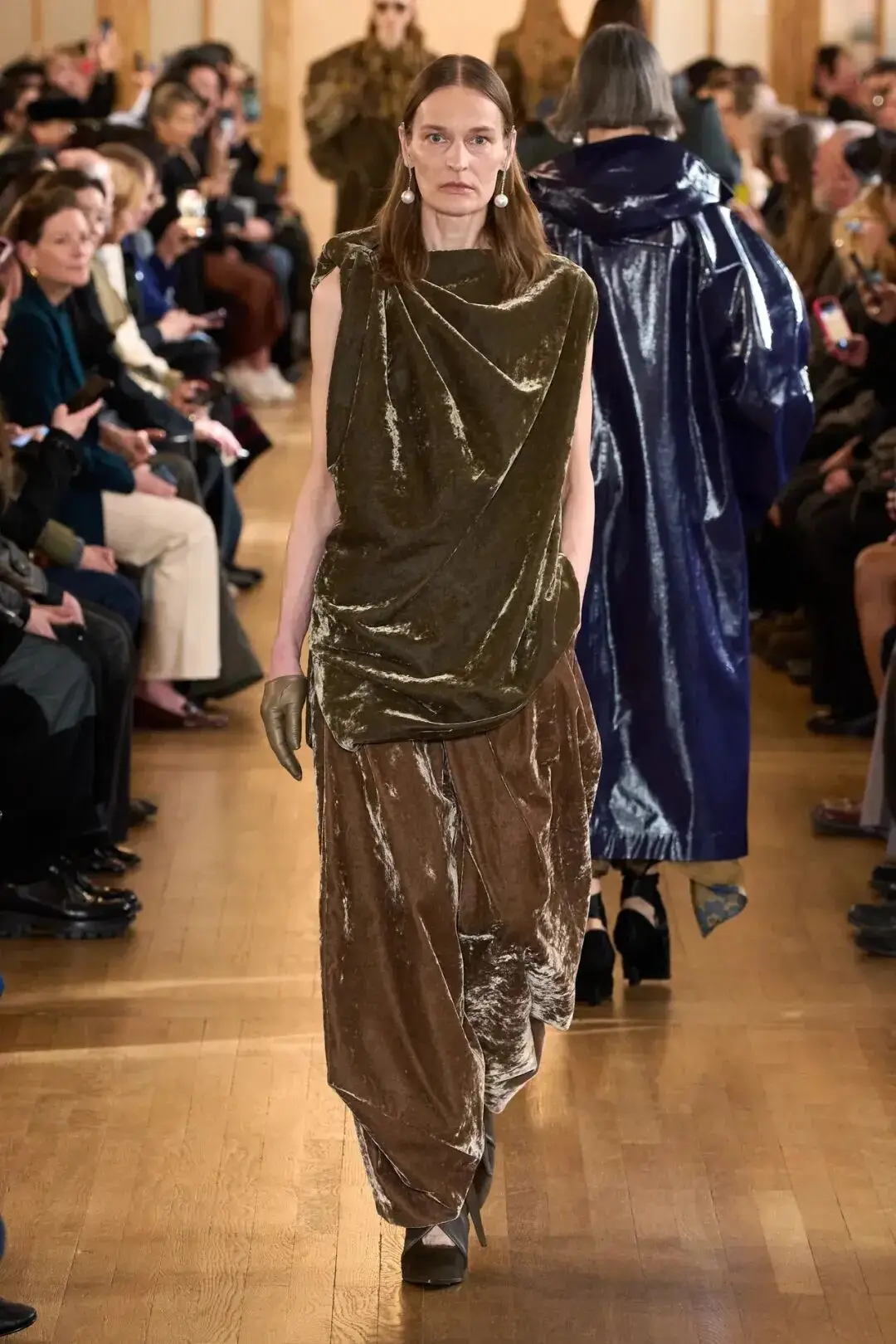雕塑般的轮廓:受竞技场宏伟结构的启发,宽肩、利落的夹克与大衣被塑造出夸张的斜角与曲线,如同被时光打磨的巨石,充满体积感与稳定性。层叠的垂褶、不对称的剪裁,在身体上构建出流动的建筑线条。