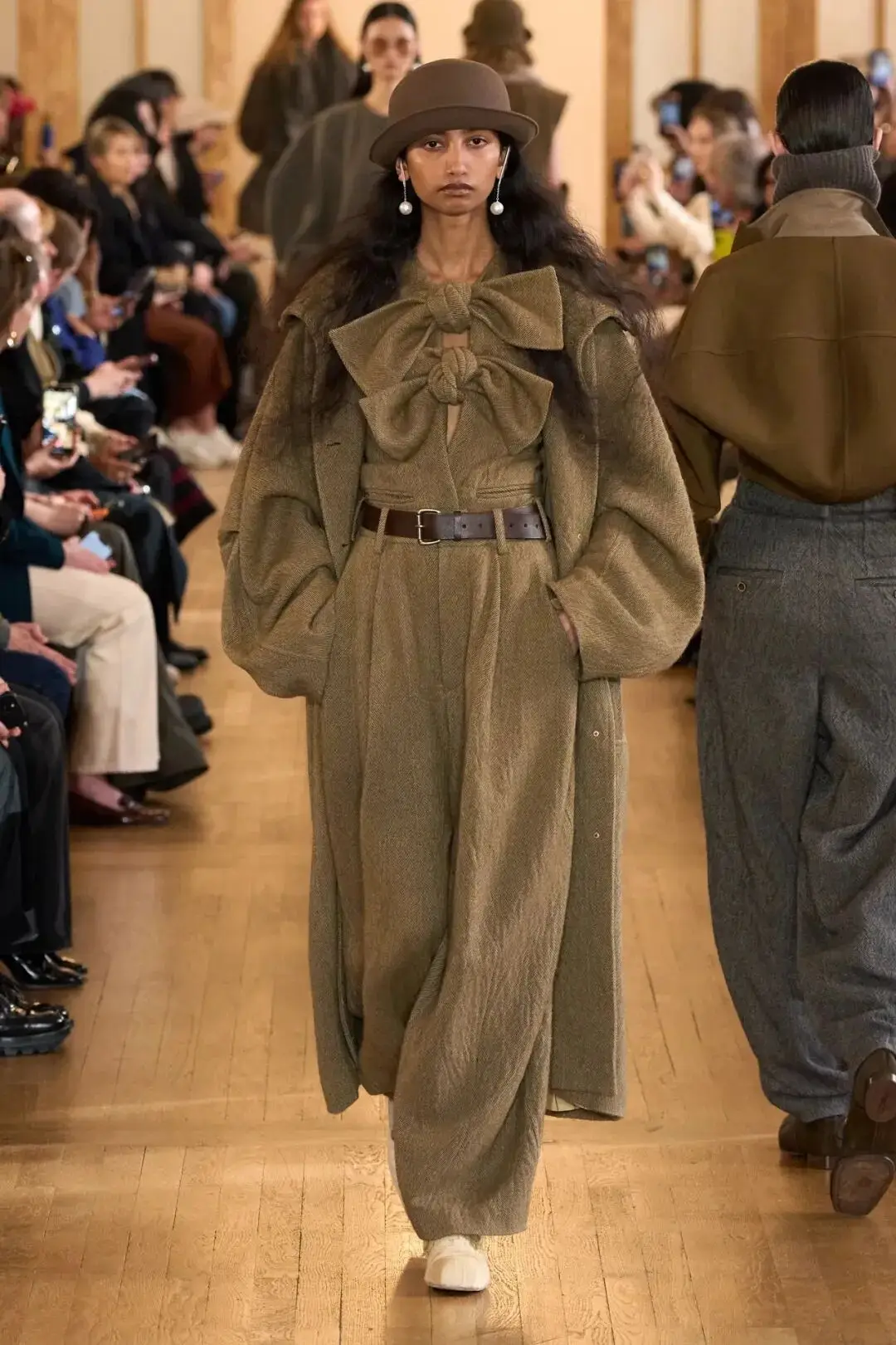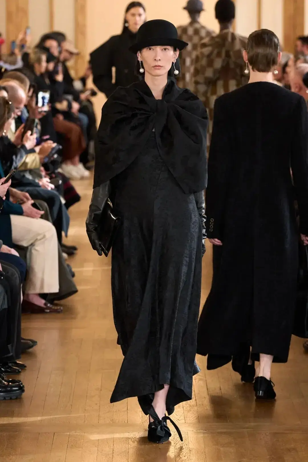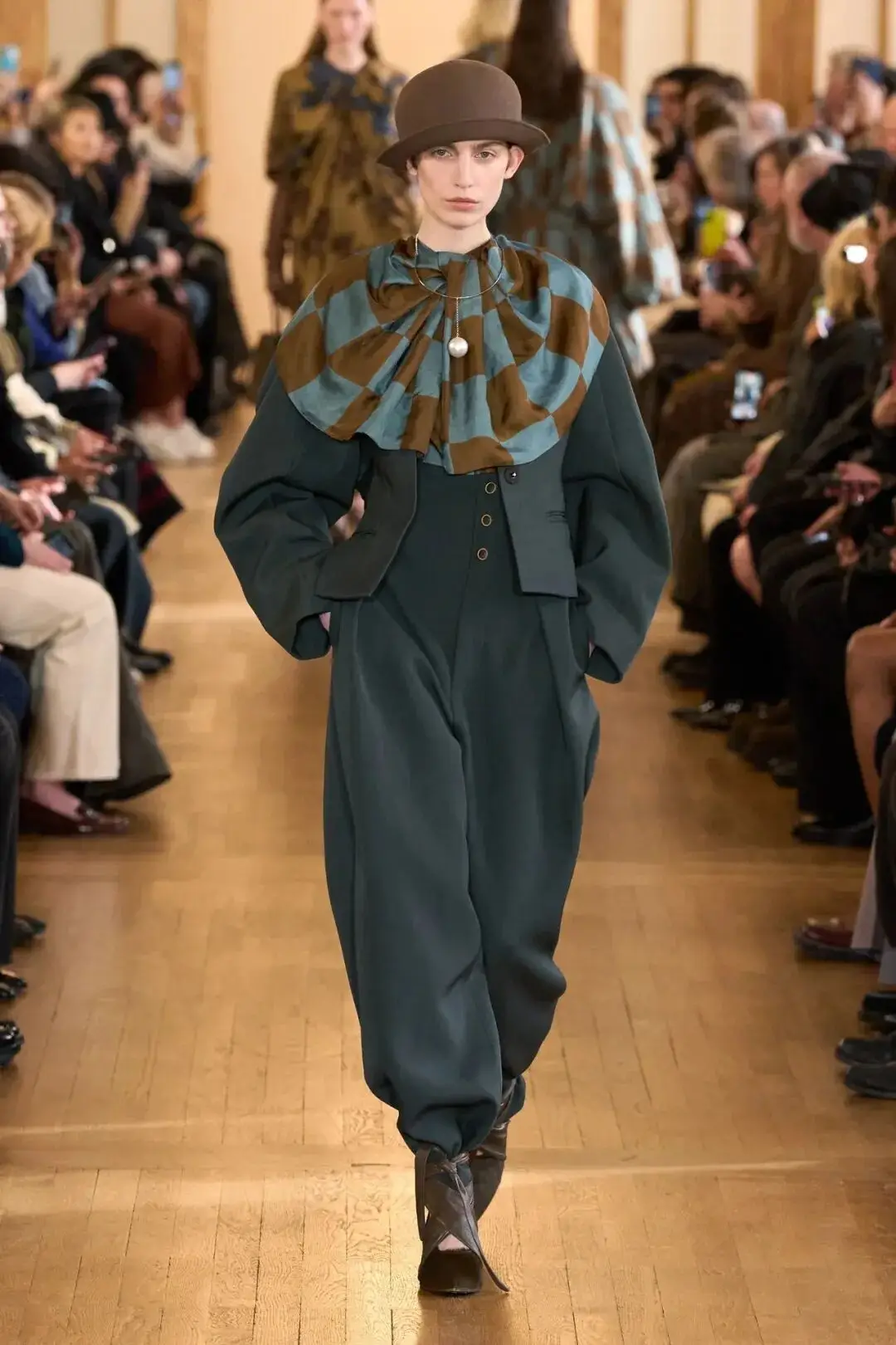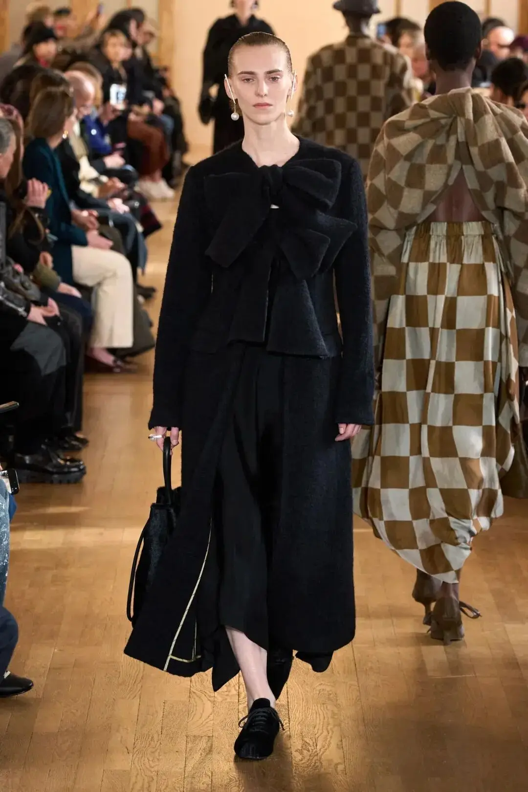 细节的诗意:系列中暗藏诸多叙事细节。受竞技场棋盘格地板启发的格纹图案、复古的暗纹碎花悄然点缀;大蝴蝶结、打结领等复古元素增添文艺气息;而一款膝处收褶的流畅酒红色长裙搭配同色歌剧手套的造型,更是直接致敬了歌剧之夜的高雅仪式。Uma Wang 与 Detaj 合作的珍珠首饰,如同散落的月光,为整体造型增添了一份温润而坚定的光芒