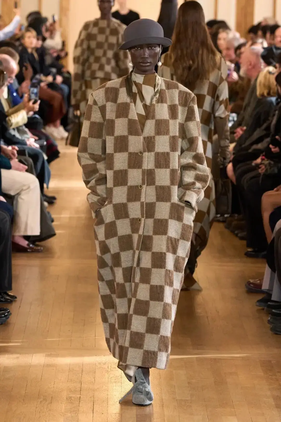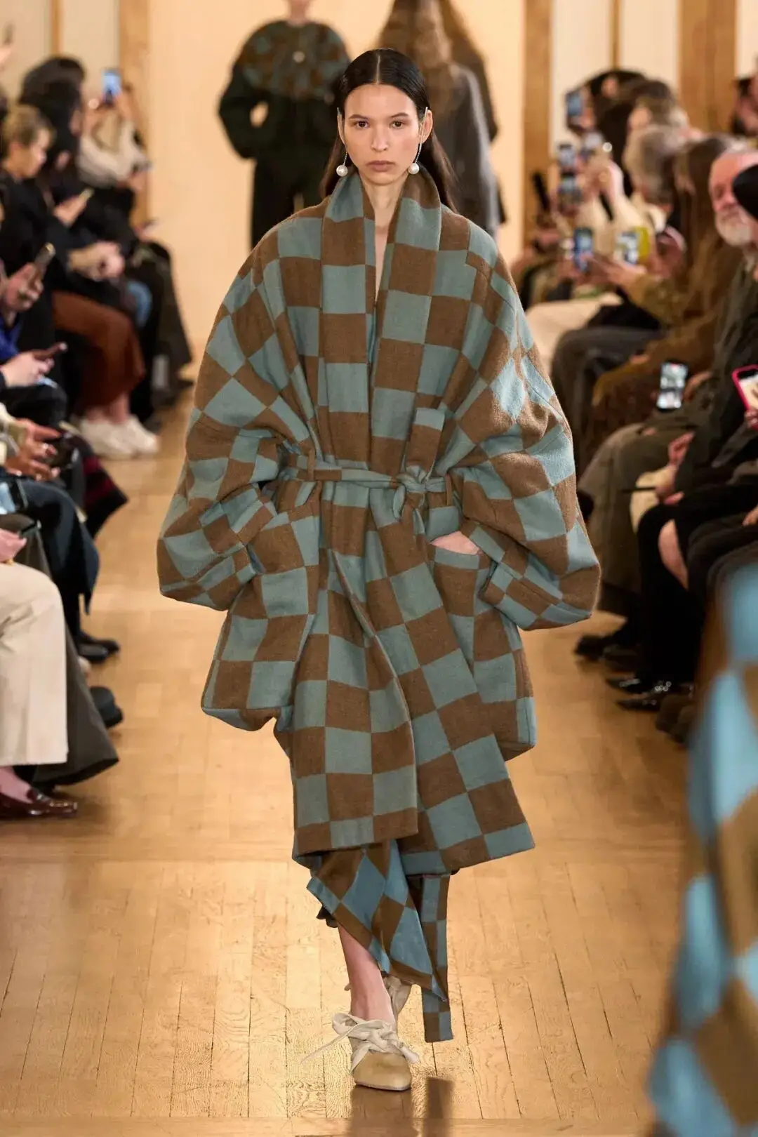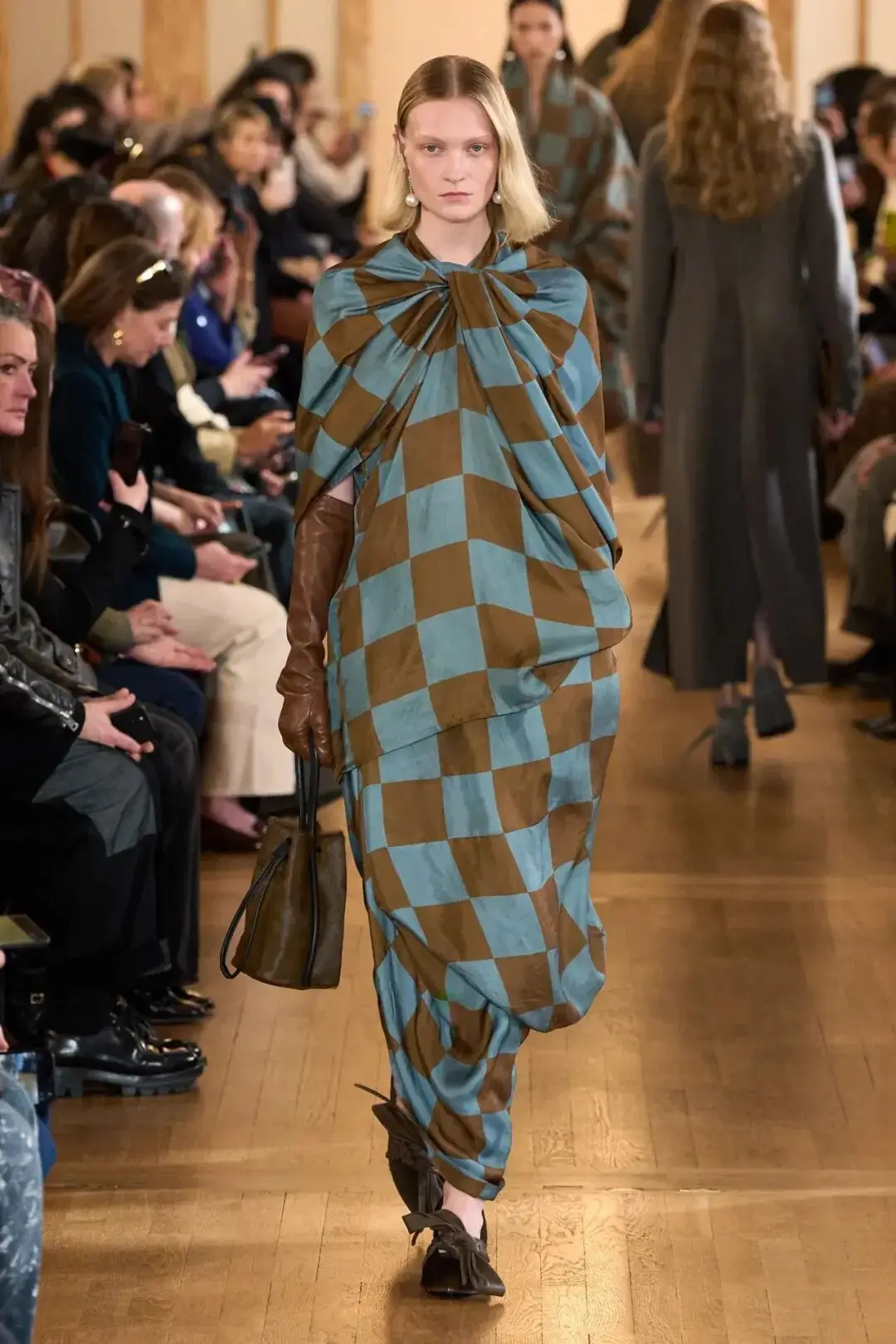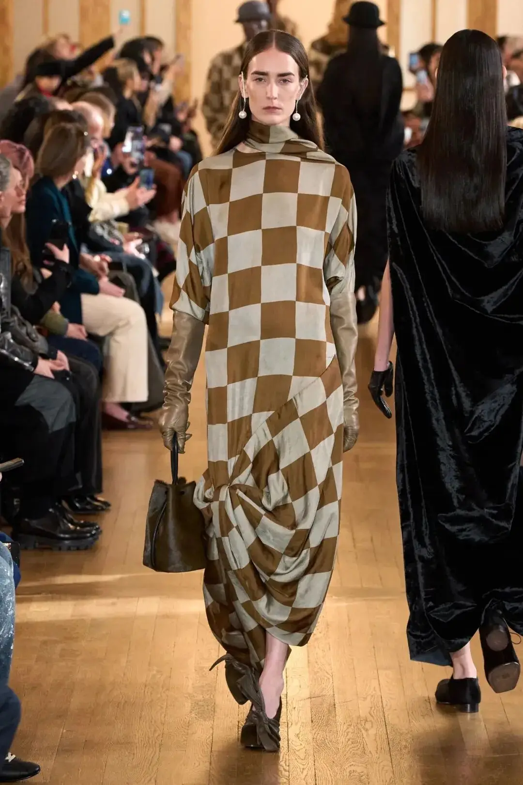 细节的诗意:系列中暗藏诸多叙事细节。受竞技场棋盘格地板启发的格纹图案、复古的暗纹碎花悄然点缀;大蝴蝶结、打结领等复古元素增添文艺气息;而一款膝处收褶的流畅酒红色长裙搭配同色歌剧手套的造型,更是直接致敬了歌剧之夜的高雅仪式。Uma Wang 与 Detaj 合作的珍珠首饰,如同散落的月光,为整体造型增添了一份温润而坚定的光芒