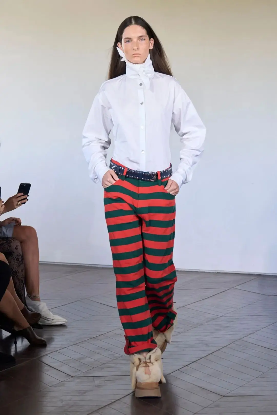 白色的衬衫上衣在高领的设计中,修饰了脖颈线条,也在利落干练中多了一些温暖细节感,搭配红绿撞色的条纹裤装,带来更多的存在时尚。