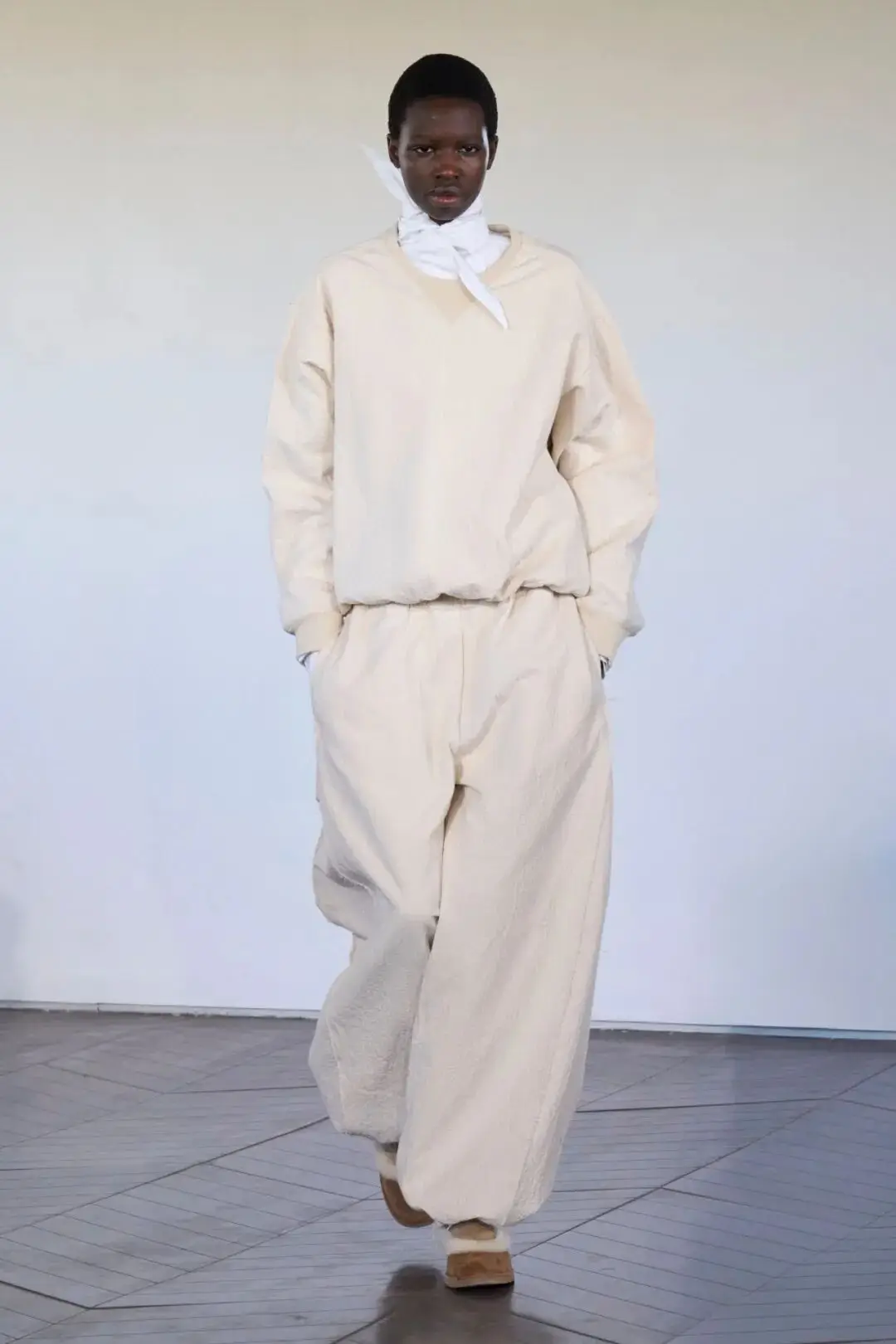 1. 通勤LOOK:象牙白模块化西装+奶油色修身针织+高腰直筒裤+UGG Zora平底鞋,优雅又舒适。
