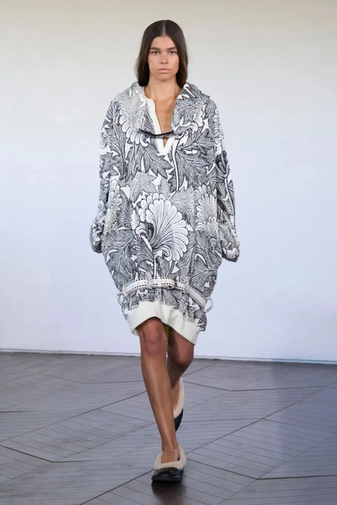 廓形感的裙装在线条的休闲舒适感中,经典的黑白色彩在视觉对比中,多了撞色冲击,色彩对比增加了花纹图案的活力艺术感。
