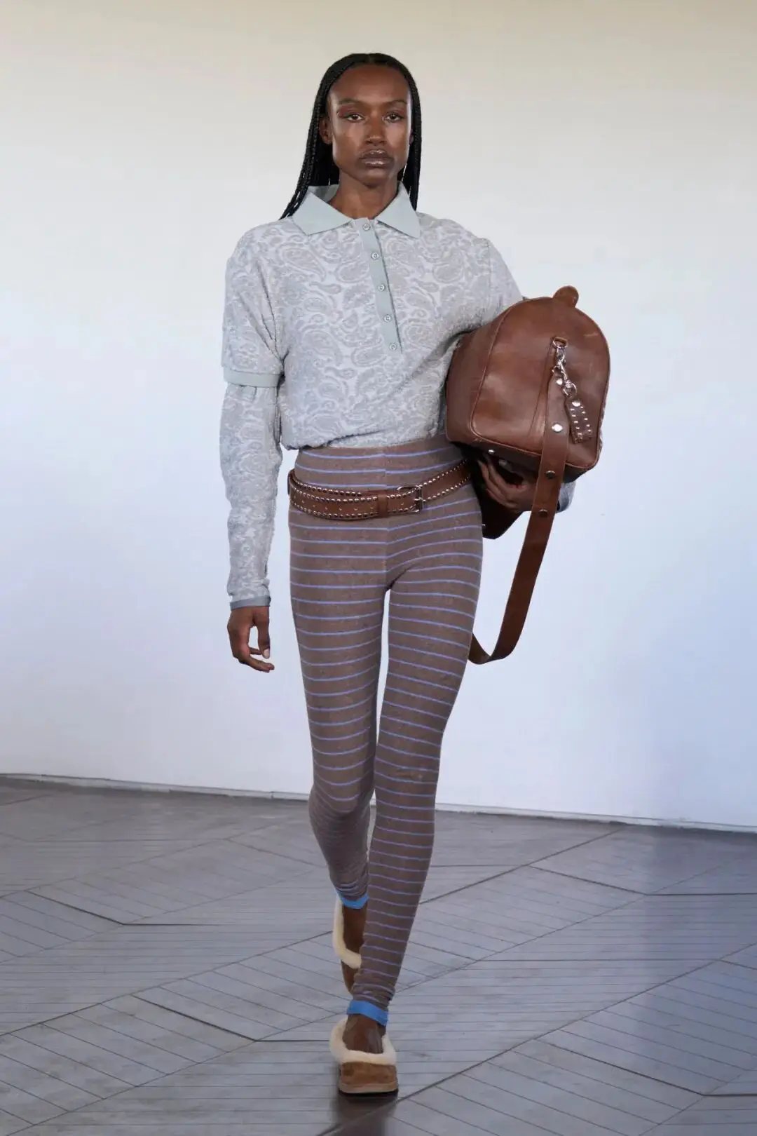 低调的灰色系颜色在同色系颜色的结合中,色彩的搭配多了一些暗纹图案的低调大方,休闲中也多了活力气质,以棕色和紫色进行撞色的条纹为修身裤装增加一些装饰时尚。