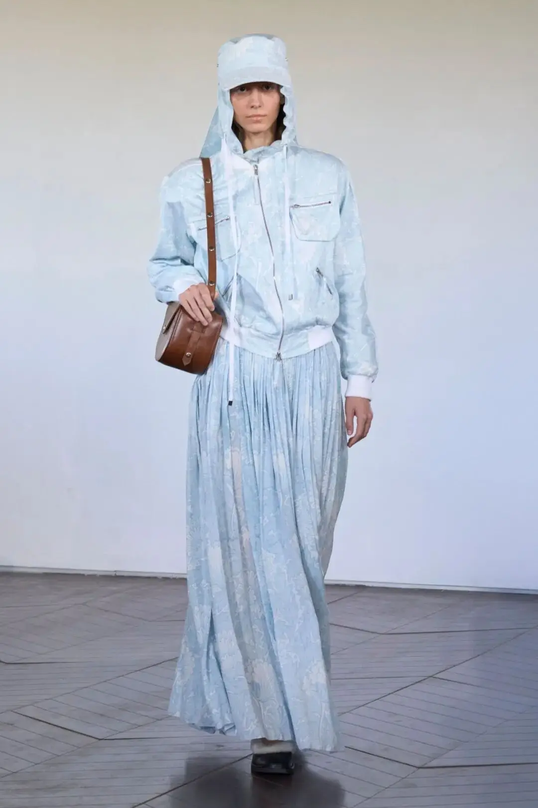 浅蓝色系的颜色在和白色等颜色的结合中多了一些清新的视觉,色彩的对比也增加了图案的活力气质,也褶皱和工装外套上衣的款式增加了更多的休闲时尚。