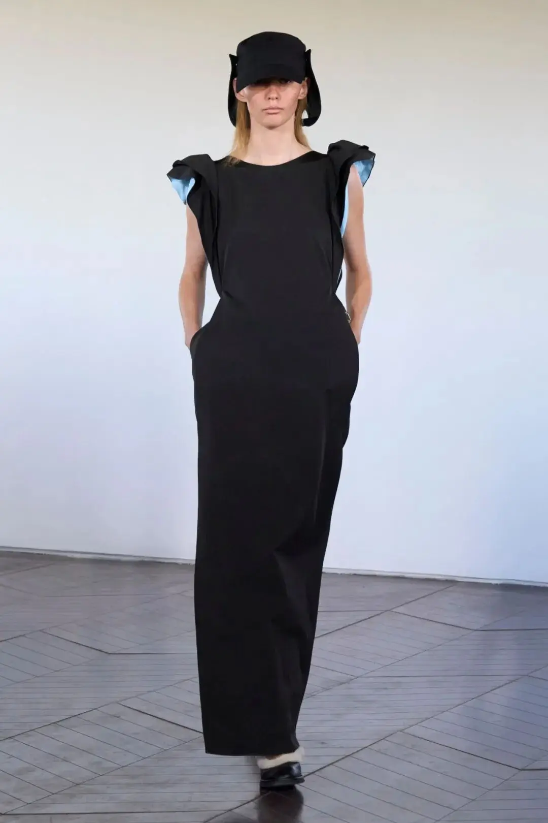 黑色的裙装以拼接荷叶边的造型作为袖子元素,在立体的造型中还多了一些甜美的细节感,结合一些小面积的蓝色颜色进行装饰也多了一些清新的细节时尚。