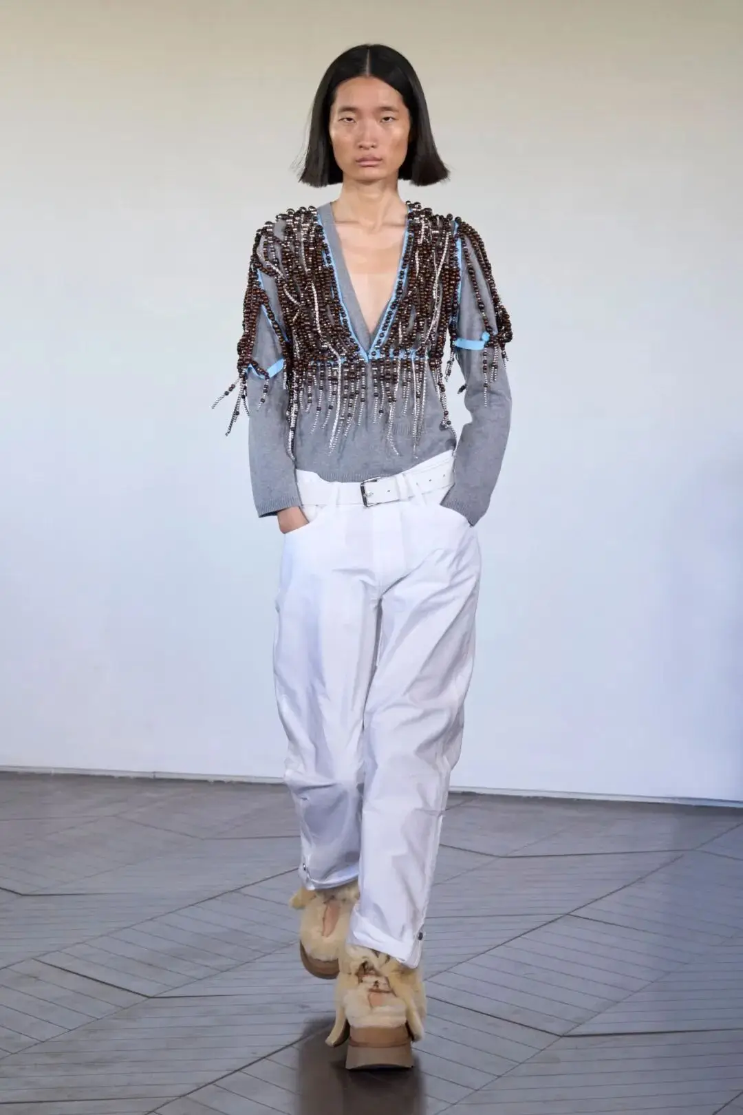 灰色的针织上衣在面料的纹理质感中,以纹理的立体元素和流苏等设计的结合,让上衣部分的设计感更足,搭配白色裤装彰显上衣的存在感。